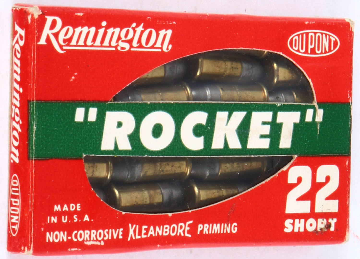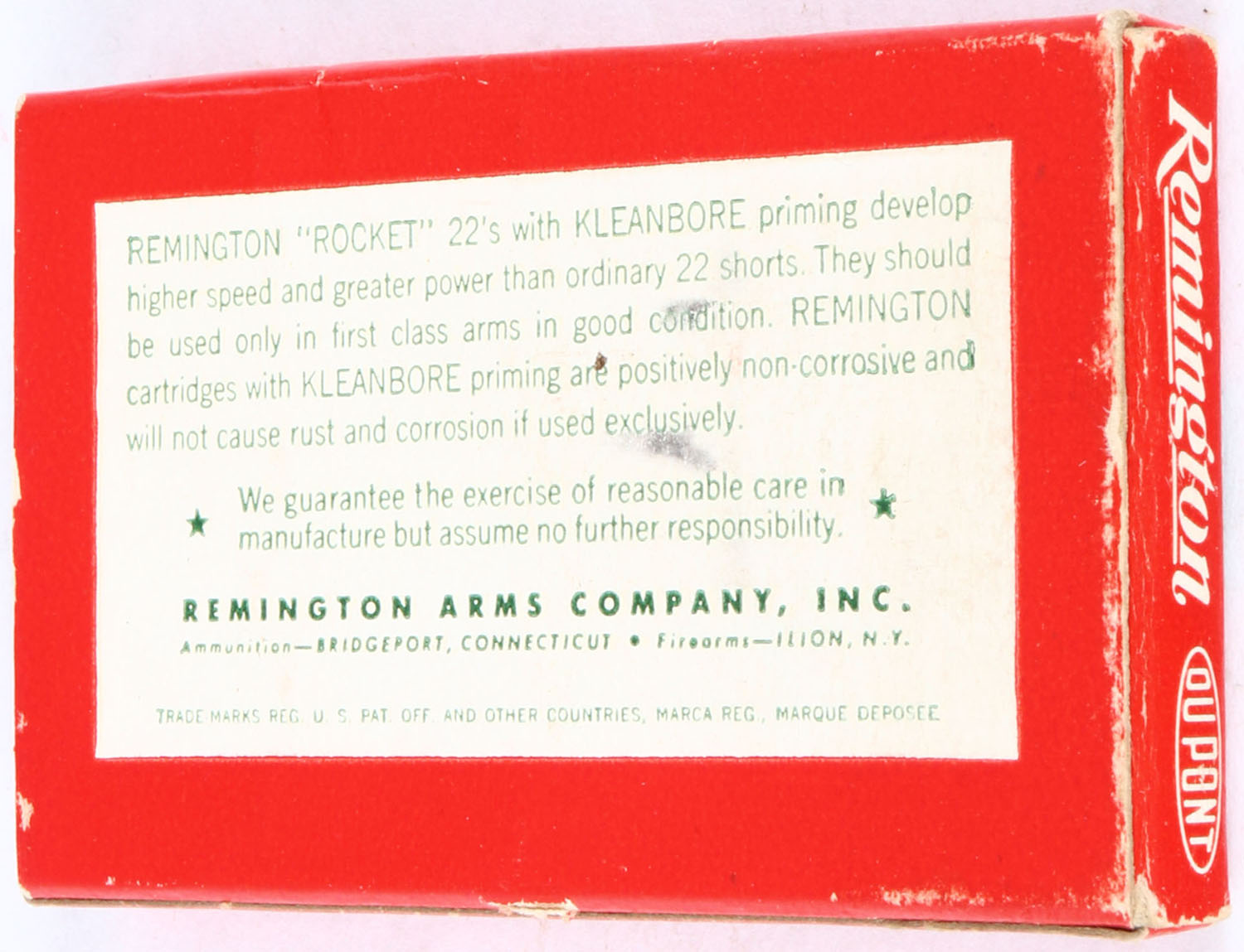 Remington, ''Rocket'', .22 Short, RHWeb: REM-14 S-5, Full, 1pc. Red green & white box, box is solid with excellent color, very minor staining to top & bottom, minor corner wear, very minor edge wear, ammo appears mint. Grade: Excellent - Value: 10 to 50