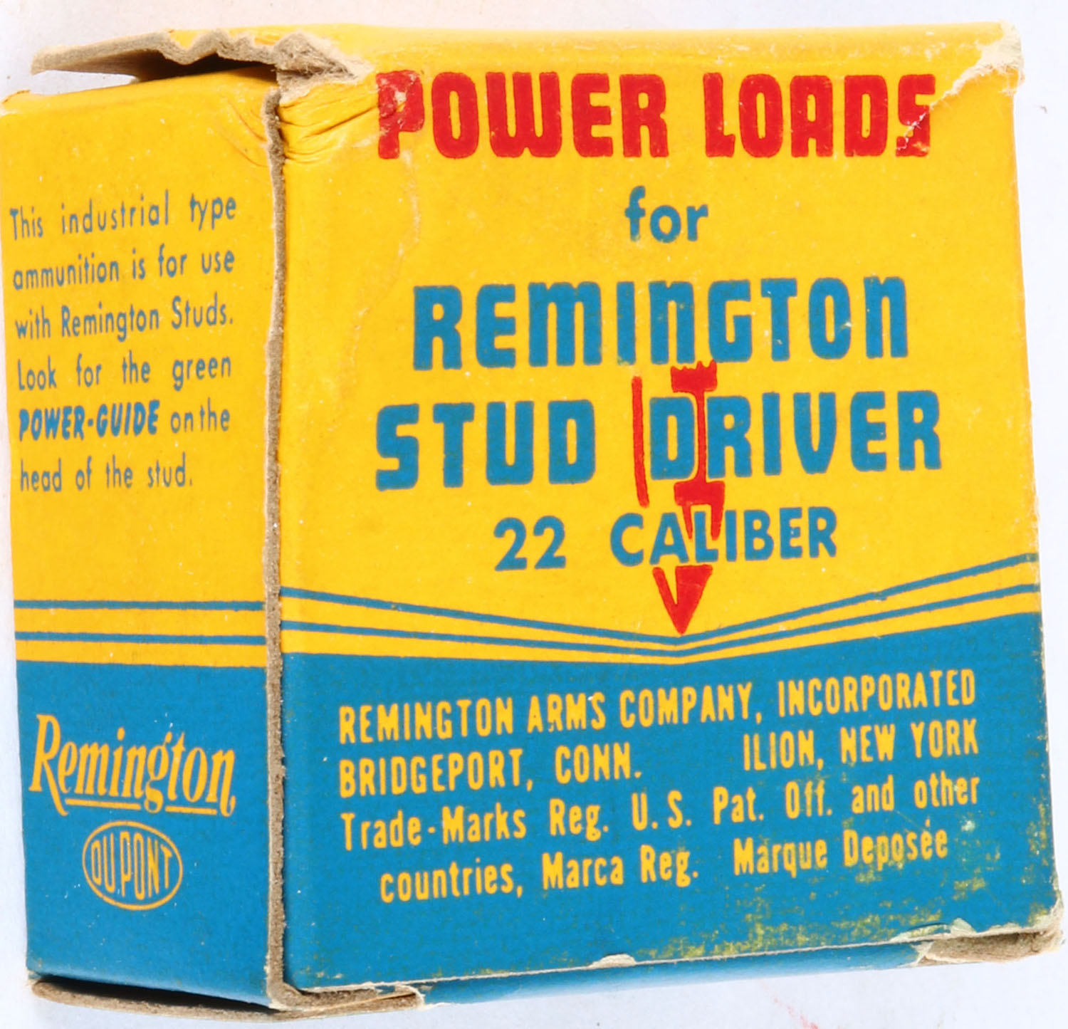 Remington, Power Loads for Remington Stud Driver, .22 Caliber, Not in RHWeb, Full, 1pc. Yellow blue & red box, box is solid with excellent color, some age soiling & shelf wear, minor edge & corner wear, flaps are solid, ammo is excellent. Grade: Excellent - Value: 10 to 50