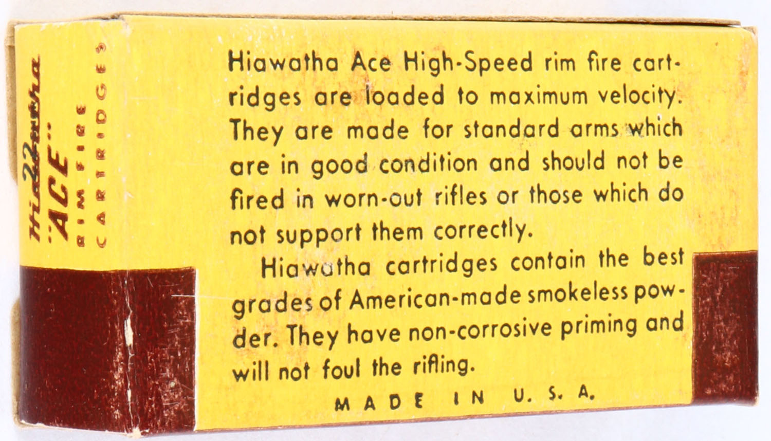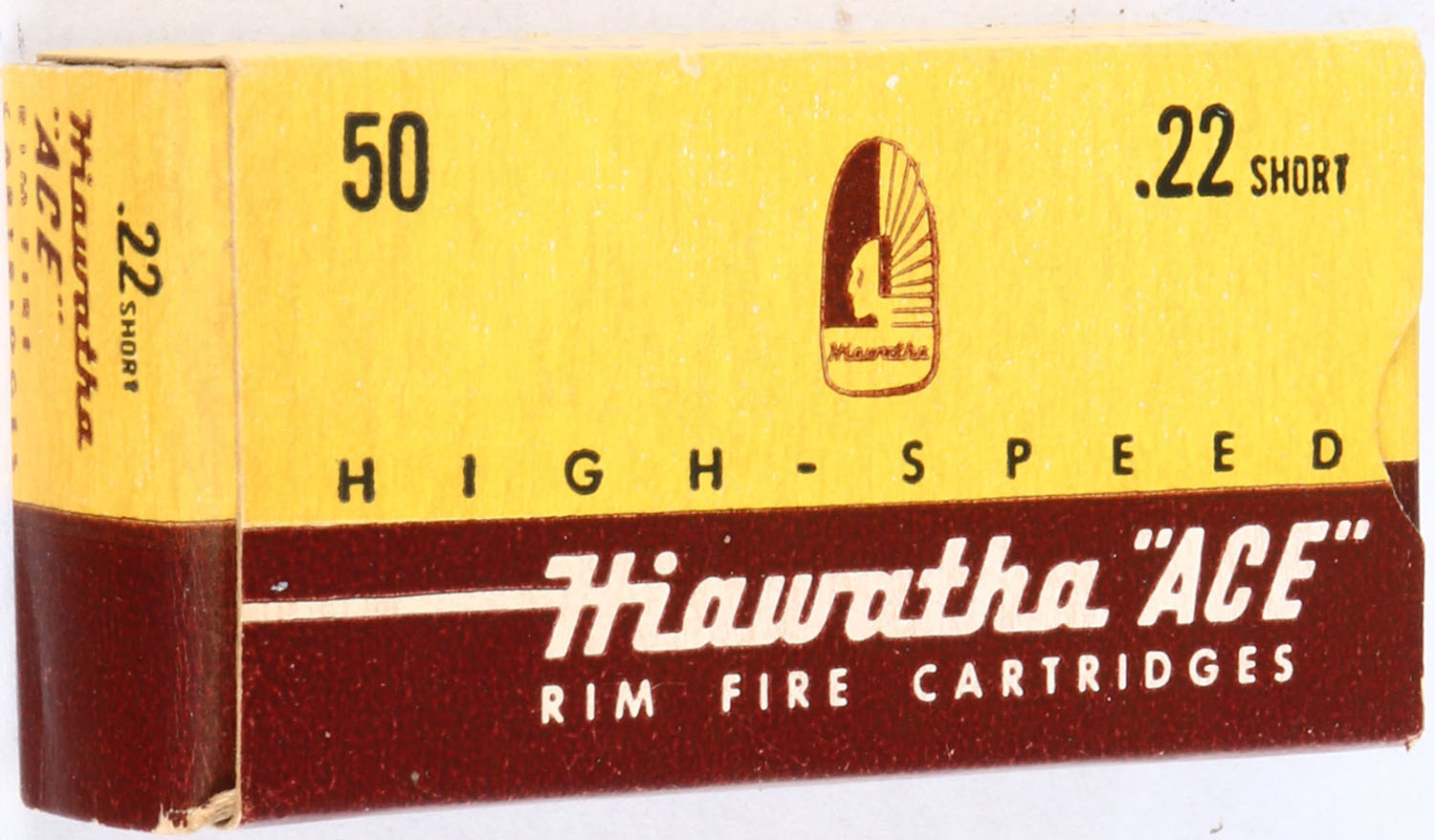 Gambles, Hiawatha ''Ace'', .22 Short, RHWeb: GS-2 S-1, Full, 1pc. Yellow brown & white box, box is solid with excellent color, minor age soiling, very minor corner wear, edges are crisp, end flaps are solid, ammo is excellent. Grade: Excellent + - Value: 6 to 30