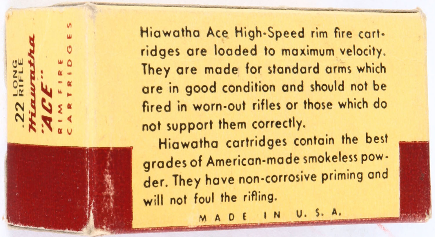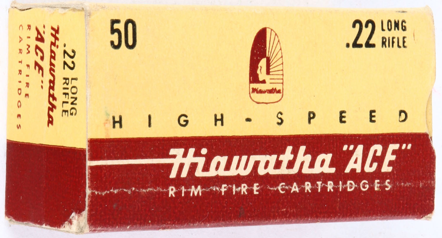Gambles, Hiawatha ''Ace'', .22 Long Rifle, RHWeb: GS-2 LR-1, Full of incorrect ammo (F-8 H/S), 1pc. Yellow brown & white box, box is solid with excellent color, very minor age soiling & corner wear, edges are mostly crisp, end flaps are solid, ammo is minty. Grade: Excellent + - Value: 2 to 20