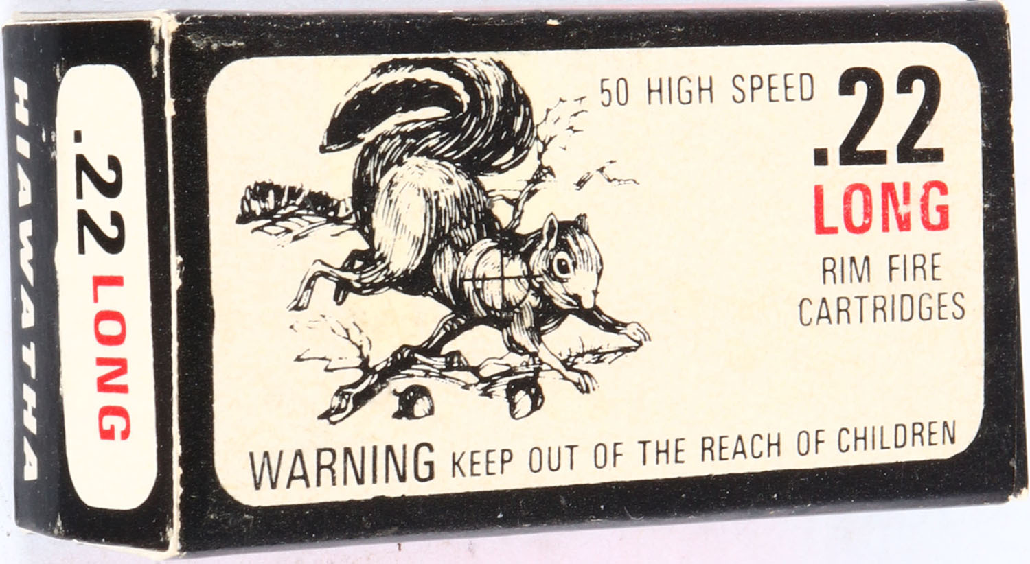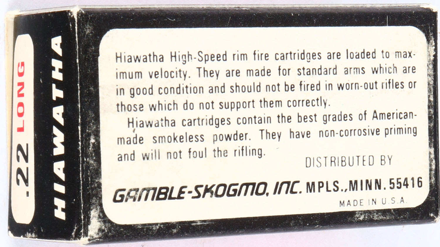 Gambles, Hiawatha, .22 Long, High Speed, RHWeb: GS-5 L-1a, Full, 1pc. White black & red box, box is solid with excellent color, very minor age soiling & corner wear, edges are crisp, end flaps are solid, ammo is minty. Grade: Excellent + - Value: 30 to 90