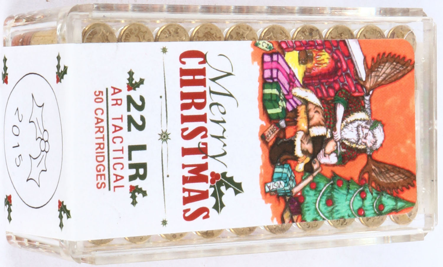 CCi, Merry Christmas 2015, .22 Long Rifle, AR Tactical, RHWeb: CCI-19 LR-12, Full & Sealed, 2pc. Clear plastic tray with label featuring whittling Santa by the fire, plastic tray is clean & clear, label is intact with minty color. Grade: MINT - Value: 50 to 150