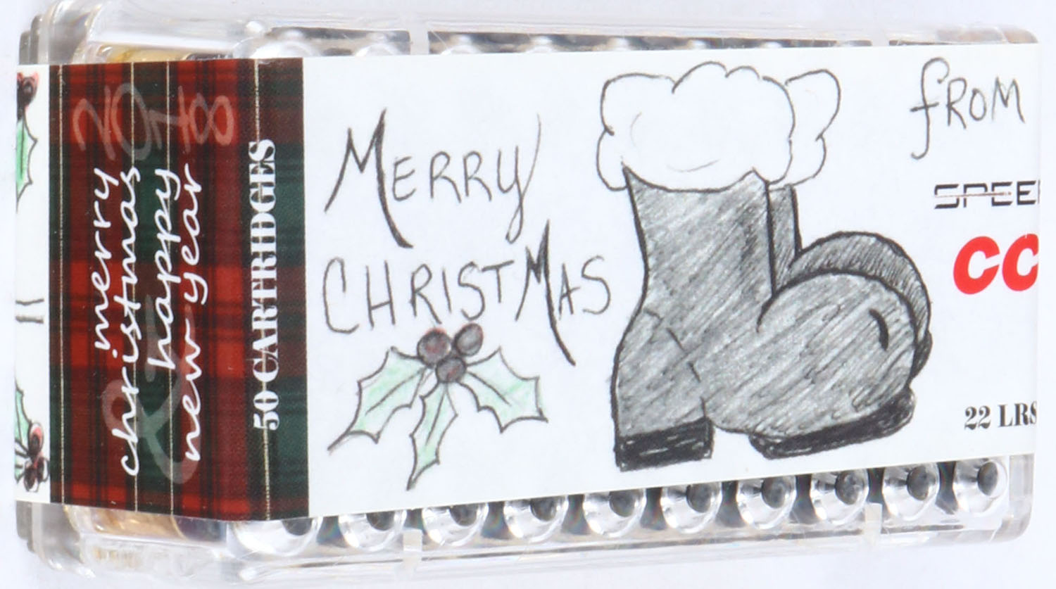 CCi, Merry Christmas 2018, .22 Long Rifle, Standard Velocity, RHWeb: CCI-19 LR-2018, Full & Sealed, 2pc. Clear plastic tray with label featuring a child's drawing of Santa's sled, plastic tray is clean & clear, label is intact with minty color. Grade: MINT - Value: 50 to 150