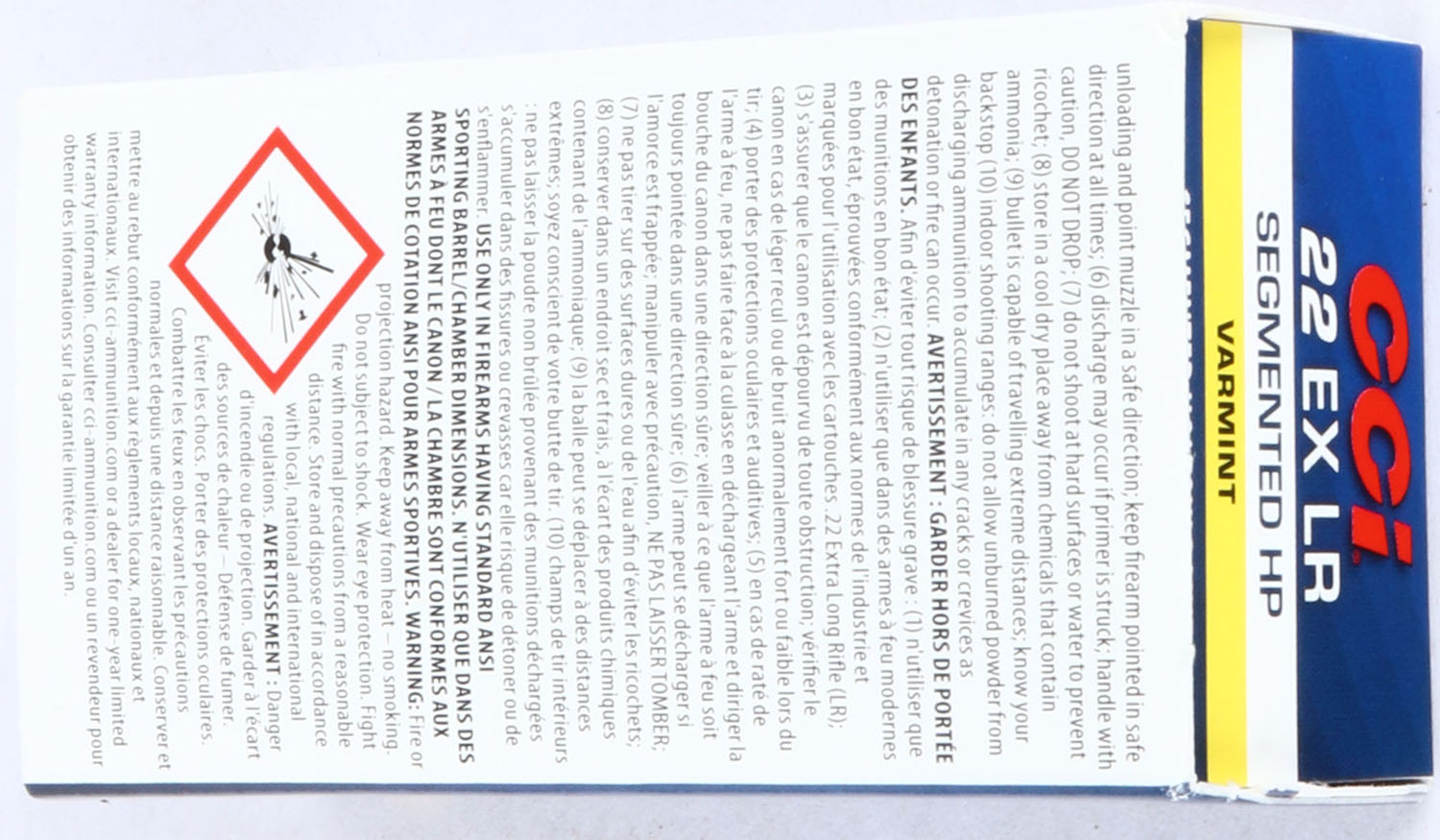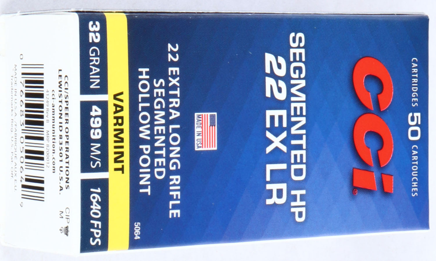 CCi, Varmint, .22 Extra Long Rifle, Segmented Hollow Point, 1pc. Full, 50rds. Blue box, box is MINT with minty color, sharp corners, crisp edges, rigid end flaps, ammo is mint. Grade: MINT - Value: 20 to 60