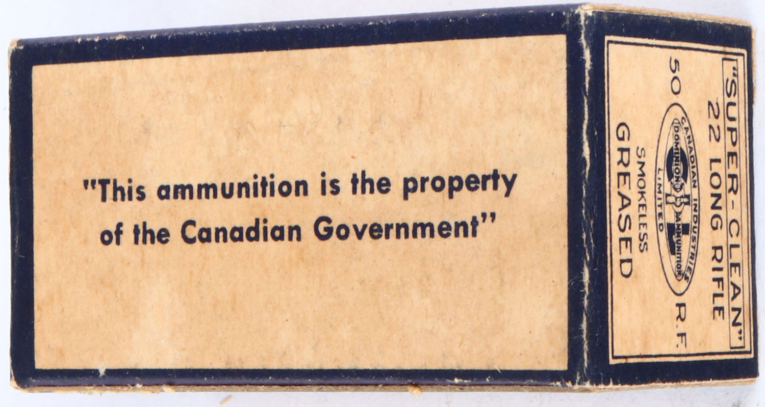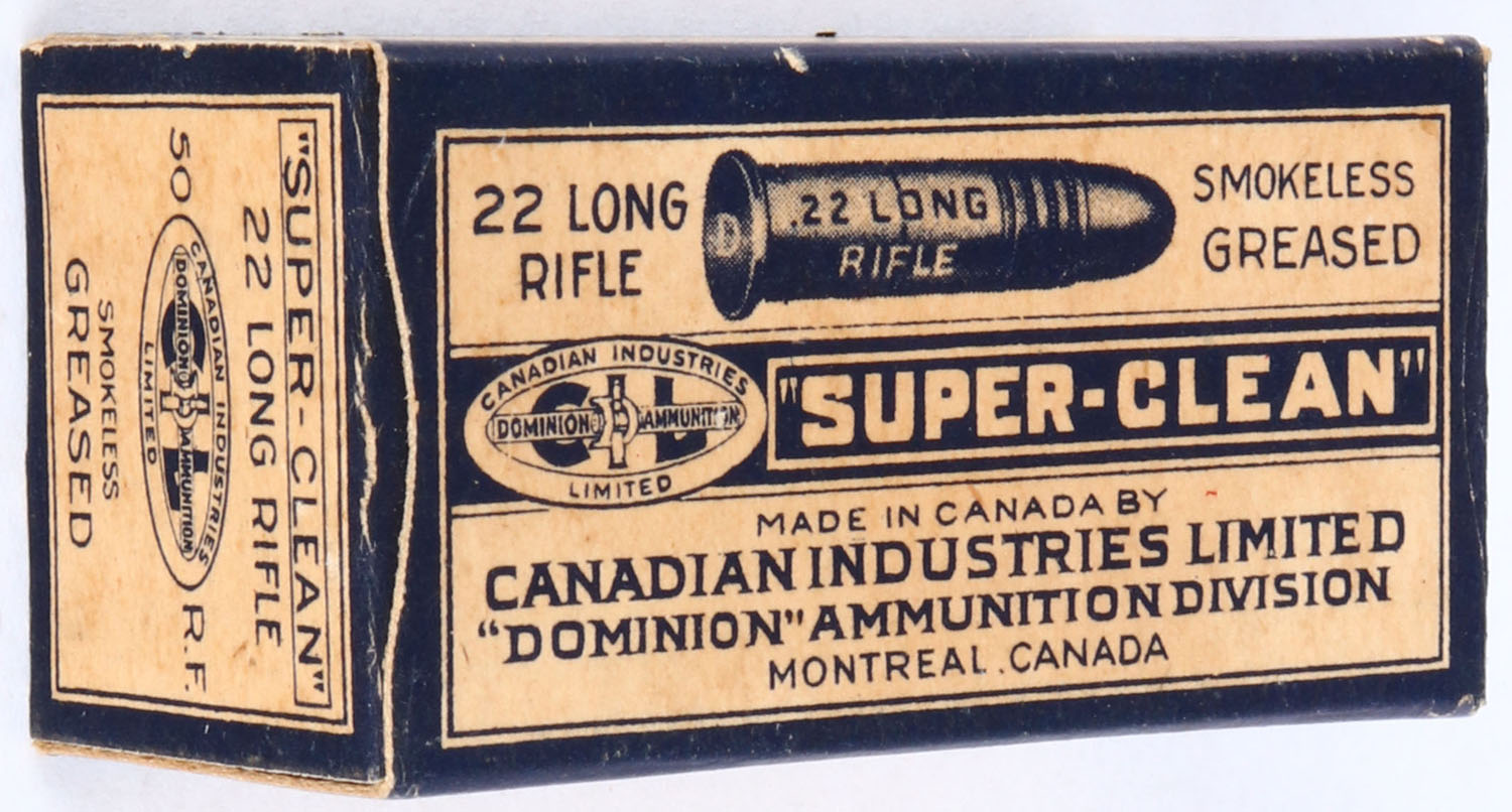 C.I.L., Super-Clean, .22 Long Rifle, Smokeless Greased, RHWeb: CIL-2 LR-3, Full, 1pc. Buff & blue box, box is solid with excellent color, very minor edge & corner wear, end flaps are solid, ammo is very good to excellent. Grade: Excellent ++ - Value: 4 to 20