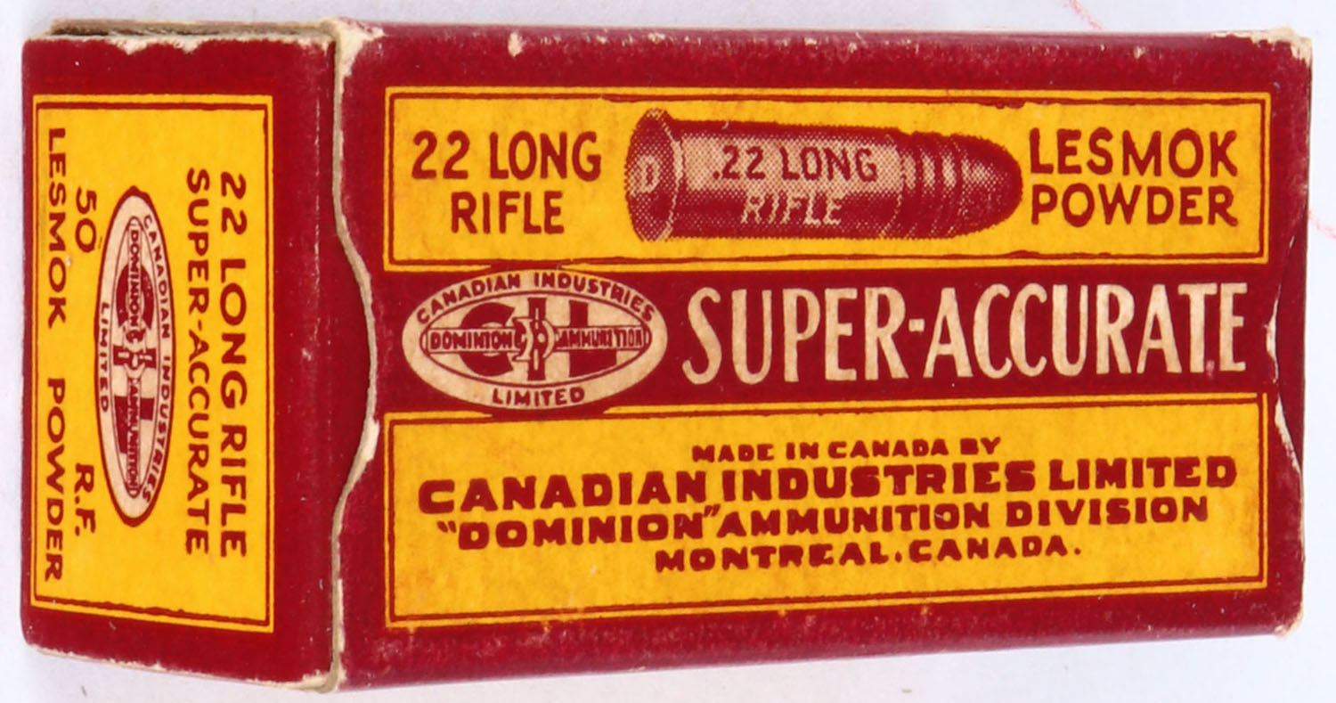 C.I.L., Super-Accurate, .22 Long Rifle, Lesmok Powder, RHWeb: CIL-2 LR-13, Full, 1pc. Yellow & maroon box, box is solid with excellent color, very minor age soiling & corner wear, edges are mostly crisp, end flaps are solid, ammo is very good to excellent. Grade: Excellent + - Value: 50 to 150