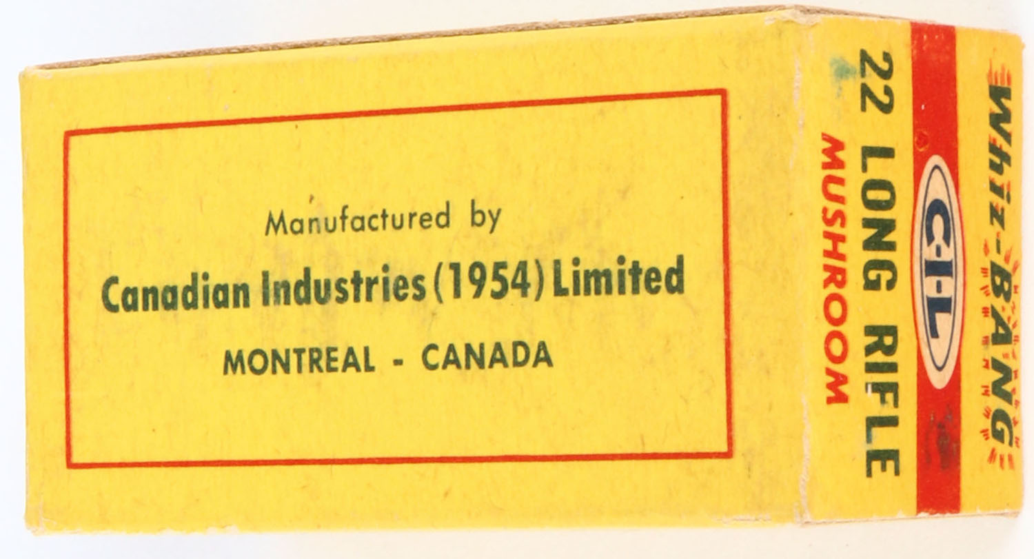 C.I.L., Whiz-Bang, .22 Long Rifle Mushroom, High Velocity, RHWeb: CIL-3 LR-2f, Full, 1pc. Yellow & red box, box is solid with excellent color, very minor age soiling, corners are mostly sharp, edges are crisp, end flaps are crisp, ammo is excellent. Grade: Excellent + - Value: 10 to 50