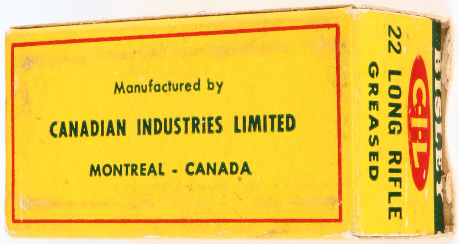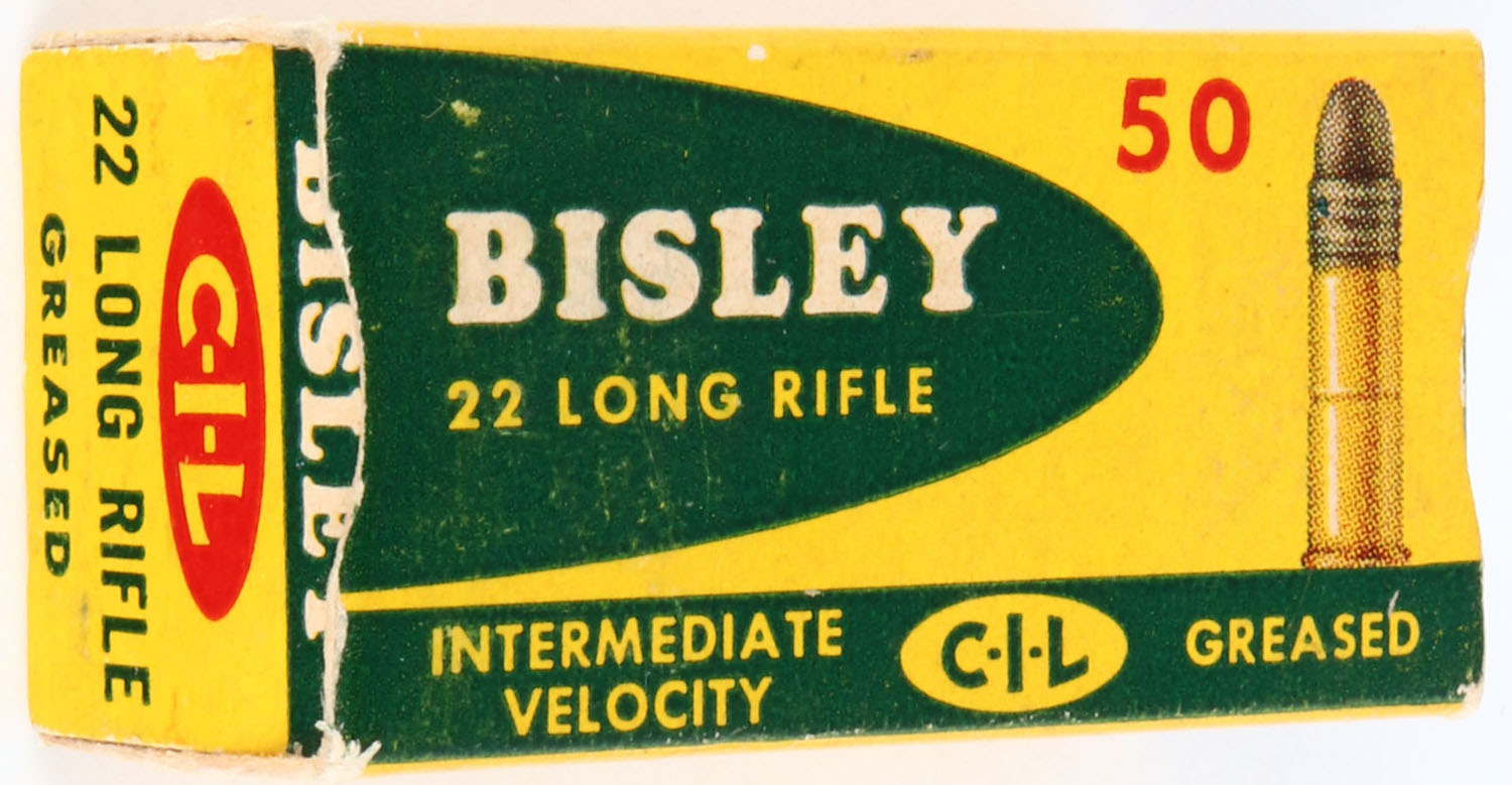 C.I.L., Bisley, .22 Long Rifle, Intermediate Velocity, RHWeb: CIL-5 LR-7, Full, 1pc. Yellow & green box, box is solid with excellent color, very minor edge & corner wear, end flaps are solid, ammo is very good. Grade: Excellent + - Value: 10 to 50