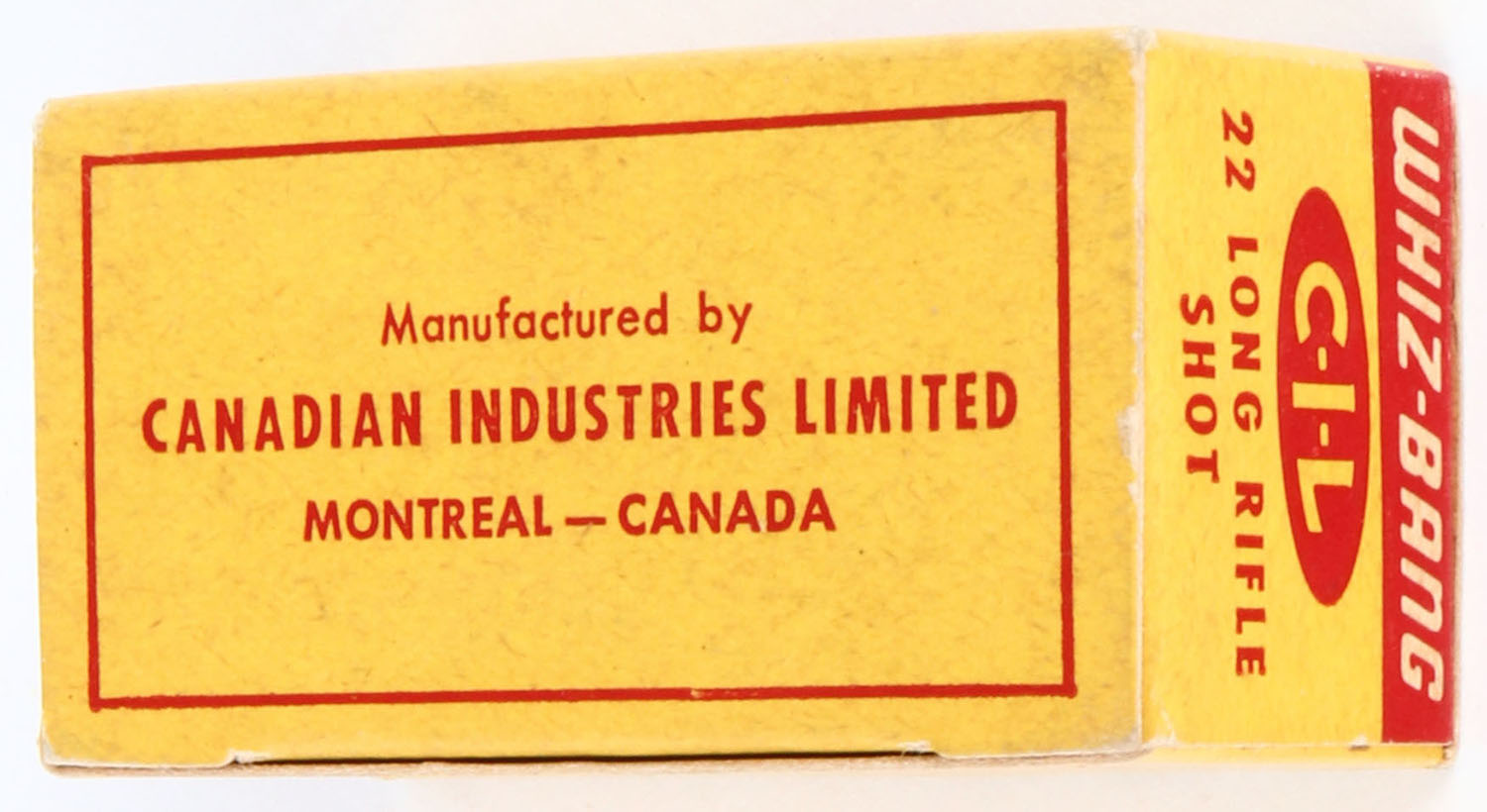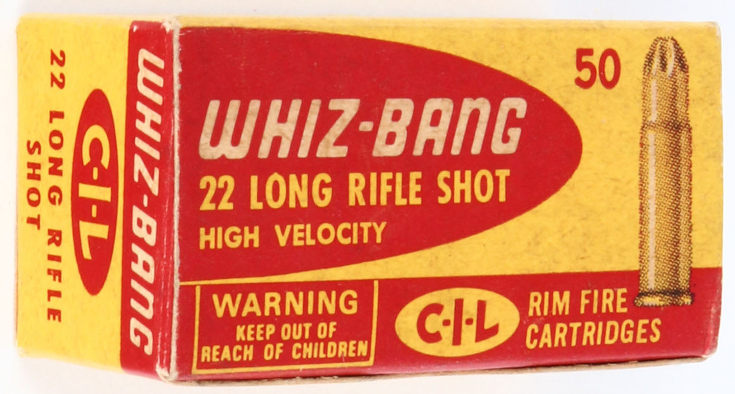C.I.L., Whiz-Bang, .22 Long Rifle Shot, High Velocity, RHWeb: CIL-6 LR-4, Full, 1pc. Yellow & red box, box is solid with excellent color, very minor age soiling & corner wear, edges are crisp, top flap is solid, ammo is minty. Grade: Excellent + - Value: 30 to 90