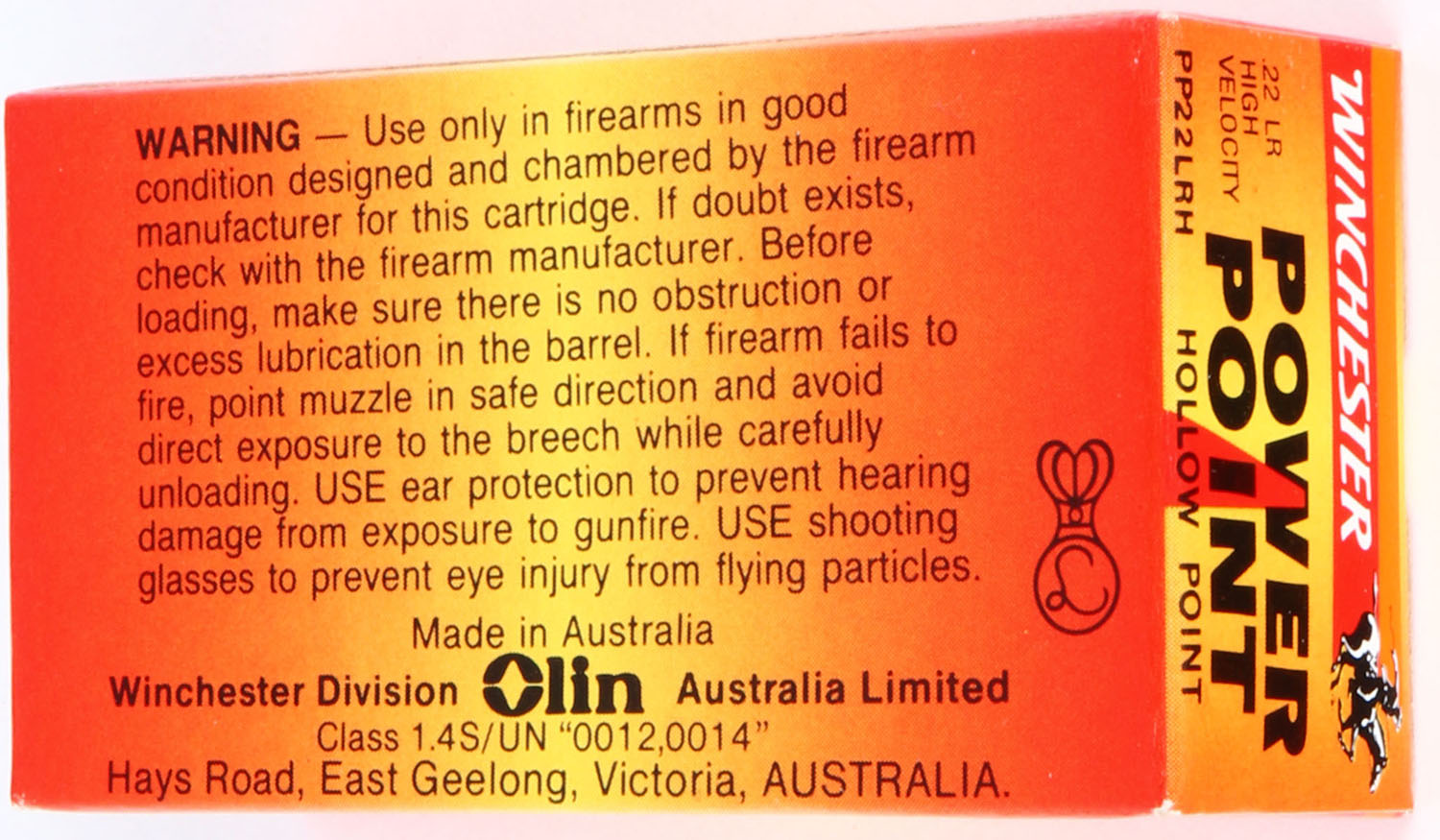 Winchester (Australia), Power Point, .22 Long Rifle Hollow Point, High Velocity, RHWeb: (Australia) POWER-1 LR-2.5, Full, 1pc. Red yellow & black box, box is MINT with mint color, corners are sharp, edges are crisp, end flaps are solid, ammo is mint. Grade: MINT - Value: 10 to 50