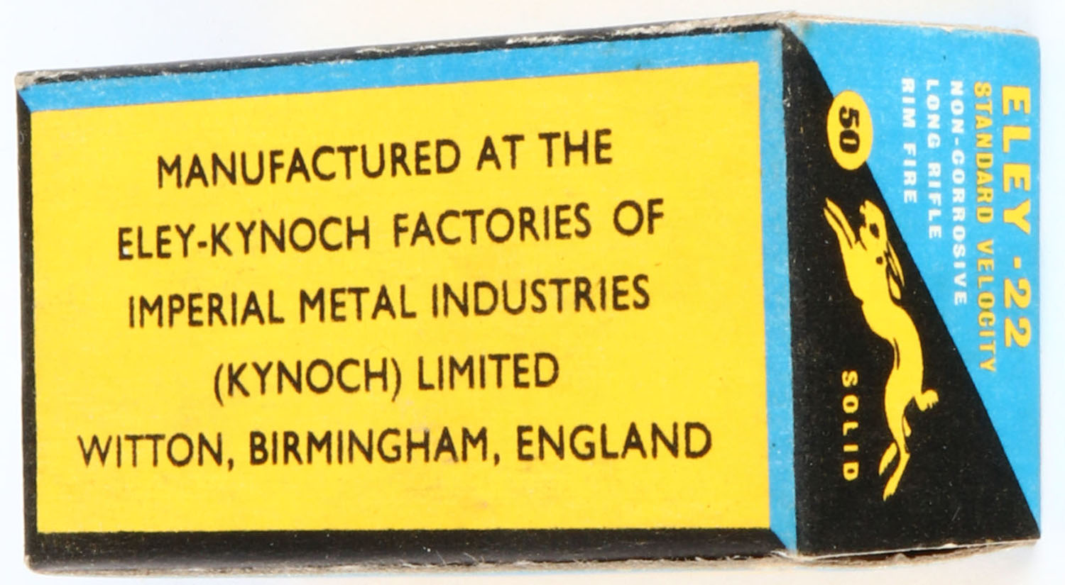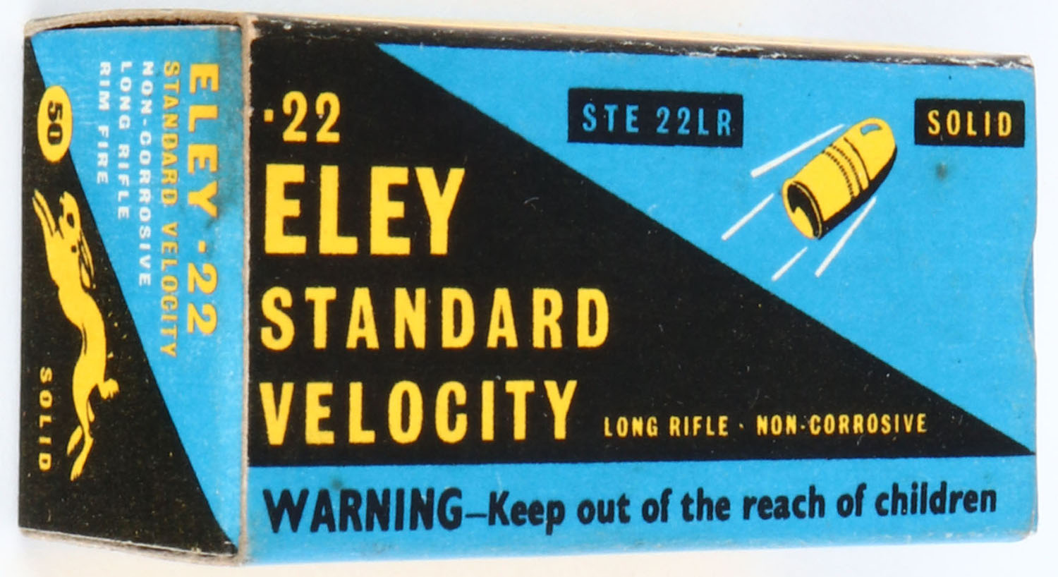 Eley, Standard Velocity, .22 Long Rifle, RHWeb: IMI-1 LR-6b, Full, 1pc. Blue black & yellow box, box is solid with excellent color, only very minor edge wear, corners are mostly sharp, edges are crisp, end flaps are solid, ammo is very good to excellent. Grade: Excellent ++ - Value: 10 to 50