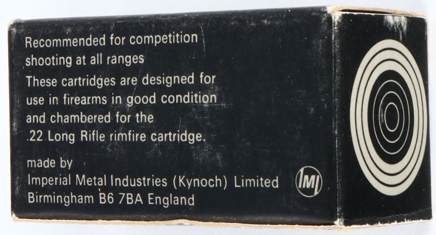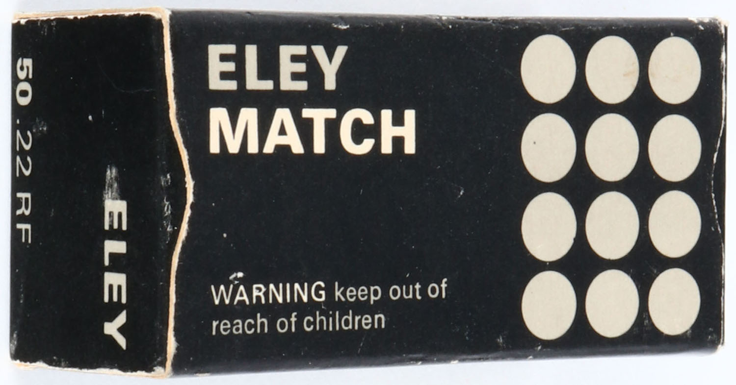 Eley, Match, .22 Long Rifle, RHWeb: IMI-2 LR-2b, Full, 1pc. Black & gray box, box is solid with excellent to minty color, very minor corner wear, edges are crisp, end flaps are solid, ammo is excellent. Grade: Excellent + - Value: 10 to 50