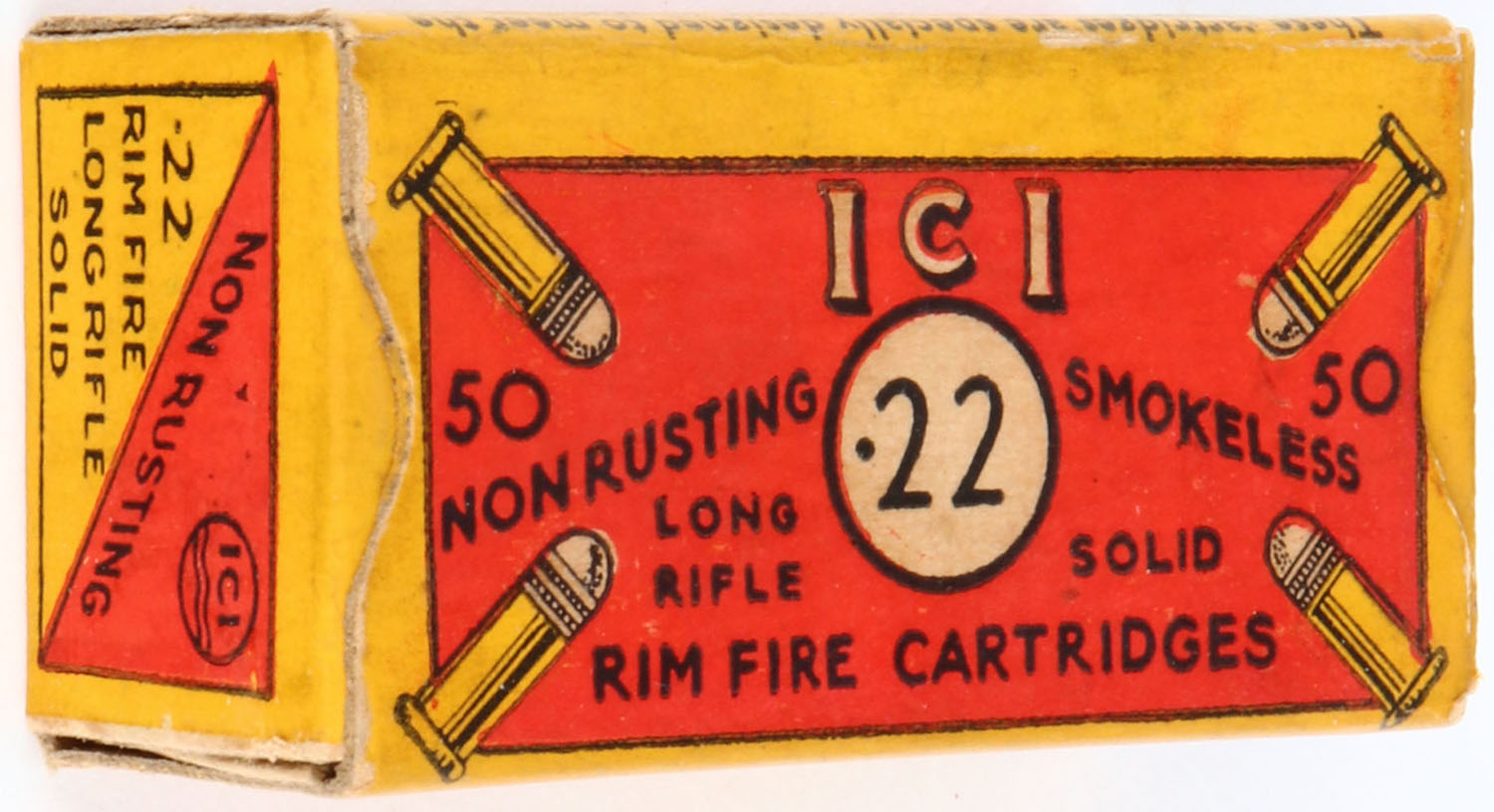 I.C.I., Non Rusting, .22 Long Rifle, Smokeless, RHWeb: ICI-2 LR-1c, Full, 1pc. Red & yellow box, box is solid with excellent color, minor age soiling, very minor corner wear, edges are crisp, end flaps are solid, ammo is very good to excellent. Grade: Excellent - Value: 10 to 50