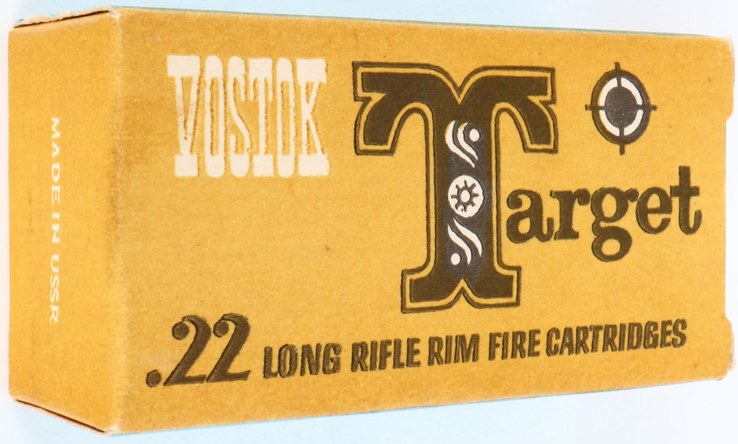 Vostok, Target, .22 Long Rifle, RHWeb: (USSR) VOST-1 LR-5a, Full, 1pc. Yellow & blue box, box is solid with excellent color, very minor color fading, very minor corner wear, edges are crisp, end flaps are solid, ammo is excellent. Grade: Excellent + - Value: 20 to 60