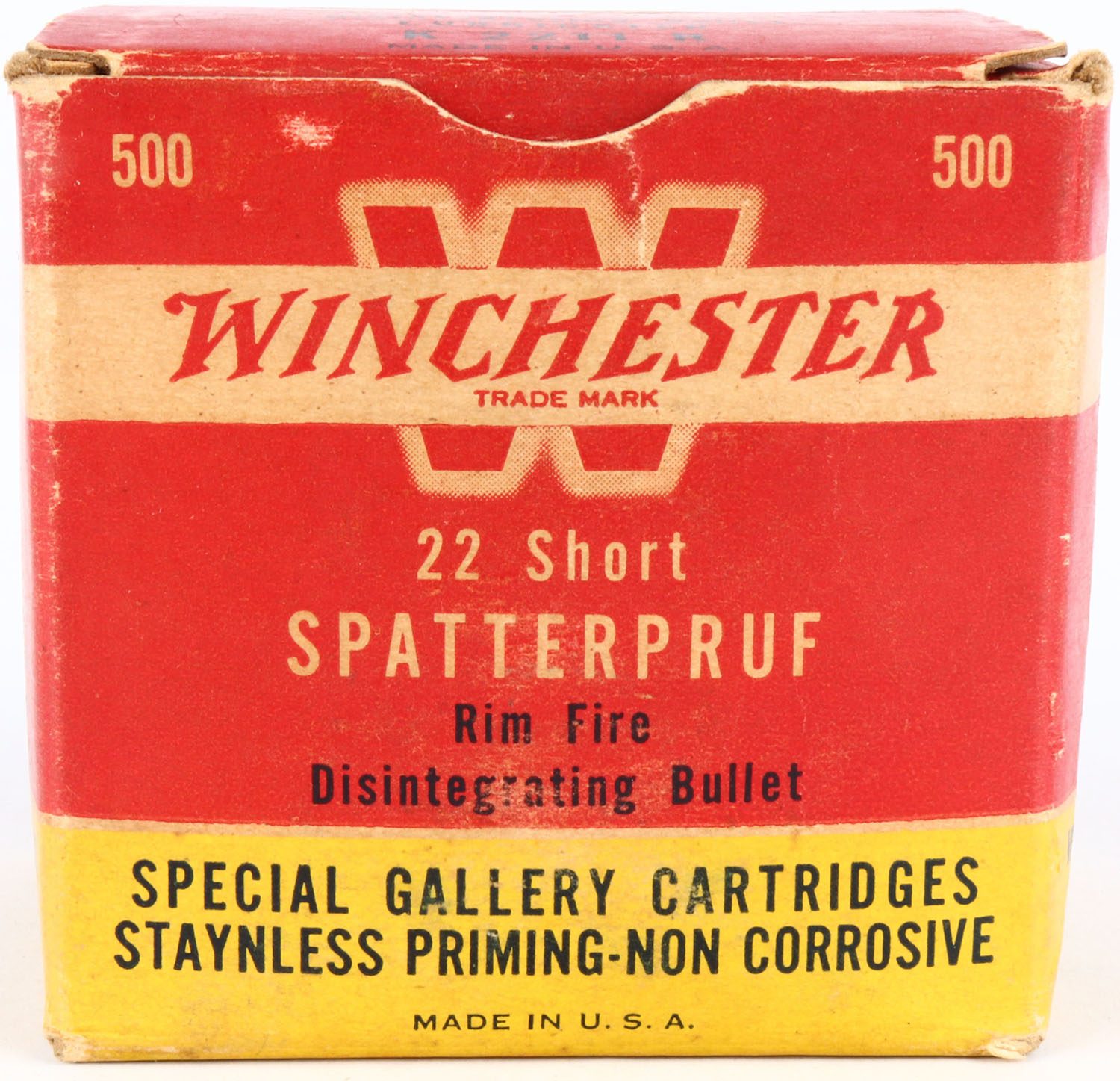 Winchester, Spatterpruf, .22 Short, Special Gallery Cartridges, Full, 500rds, 1pc. Red yellow & white bulk box, box is solid with very good color, some age soiling & shelf wear minor corner wear, very minor edge wear, top flap is solid, ammo is excellent. Grade: Very Good ++ - Value: 100 to 500