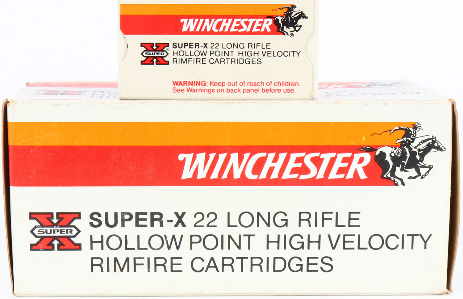 Winchester, Super-X, Long Rifle Hollow Point, High Velocity, Full, 500rds. 1pc. Gray red & orange brick, brick is solid with minty color, very minor edge & corner wear, end flaps are solid, inside boxes are mint. Grade: Excellent ++ - Value: 40 to 120