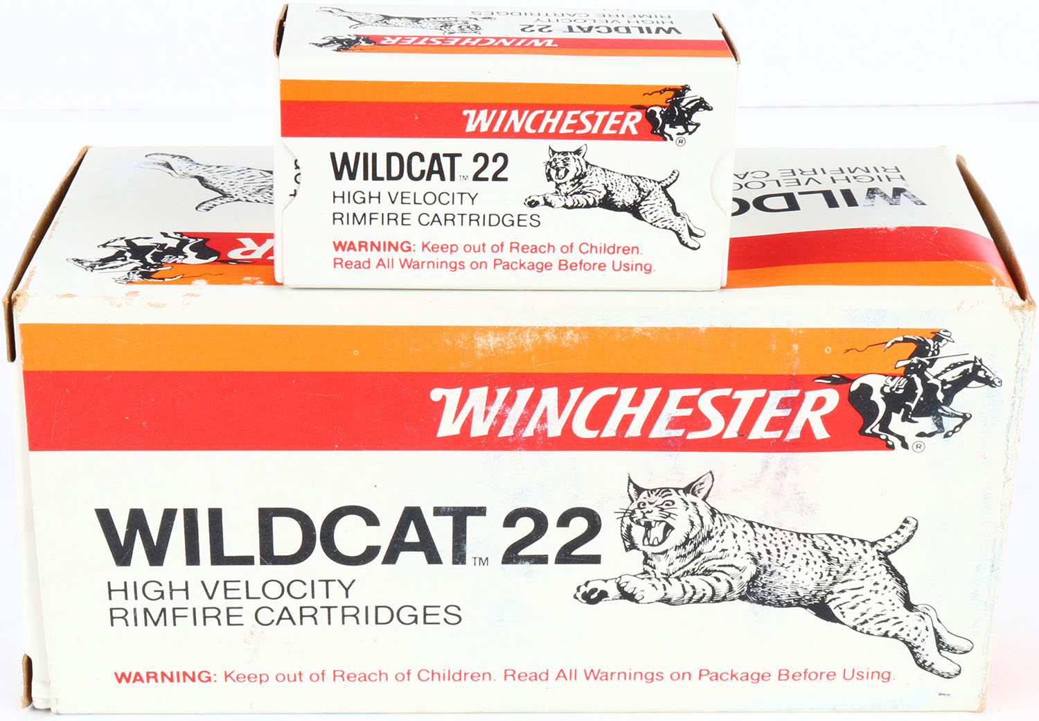 Winchester, Wildcat 22, .22 Long Rifle, High Velocity, Full, 500rds. 1pc. Gray red & orange brick, brick is solid with excellent to minty color, minor shelf wear, very minor edge & corner wear, end flaps are solid, inside boxes are mint. Grade: Excellent + - Value: 30 to 90