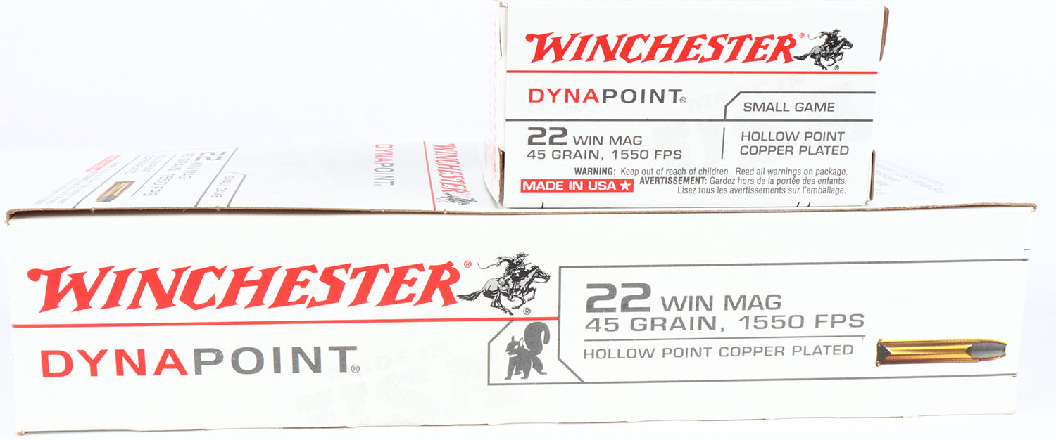 Winchester, DynaPoint, .22 Win Mag, 45 Grain Copper Plated Hollow Point, 1550 FPS, Full 250rds. 1pc white brick, brick is MINT, top flap is solid, inside boxes are mint. Grade: MINT - Value: 60 to 120