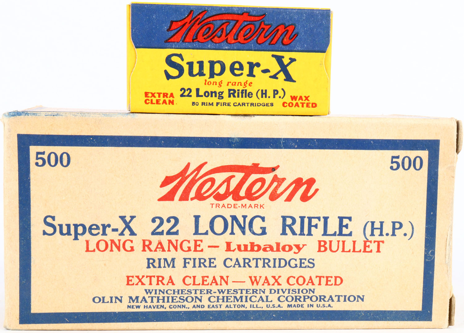 Western, Super-X, .22 Long Rifle Hollow Point, Lubaloy Bullet, Full, 500rds. Buff blue & red brick, brick is solid with excellent color, very minor color bleeding & corner wear, edges are mostly crisp, end flaps are solid, inside boxes are minty. Grade: Excellent + - Value: 100 to 300