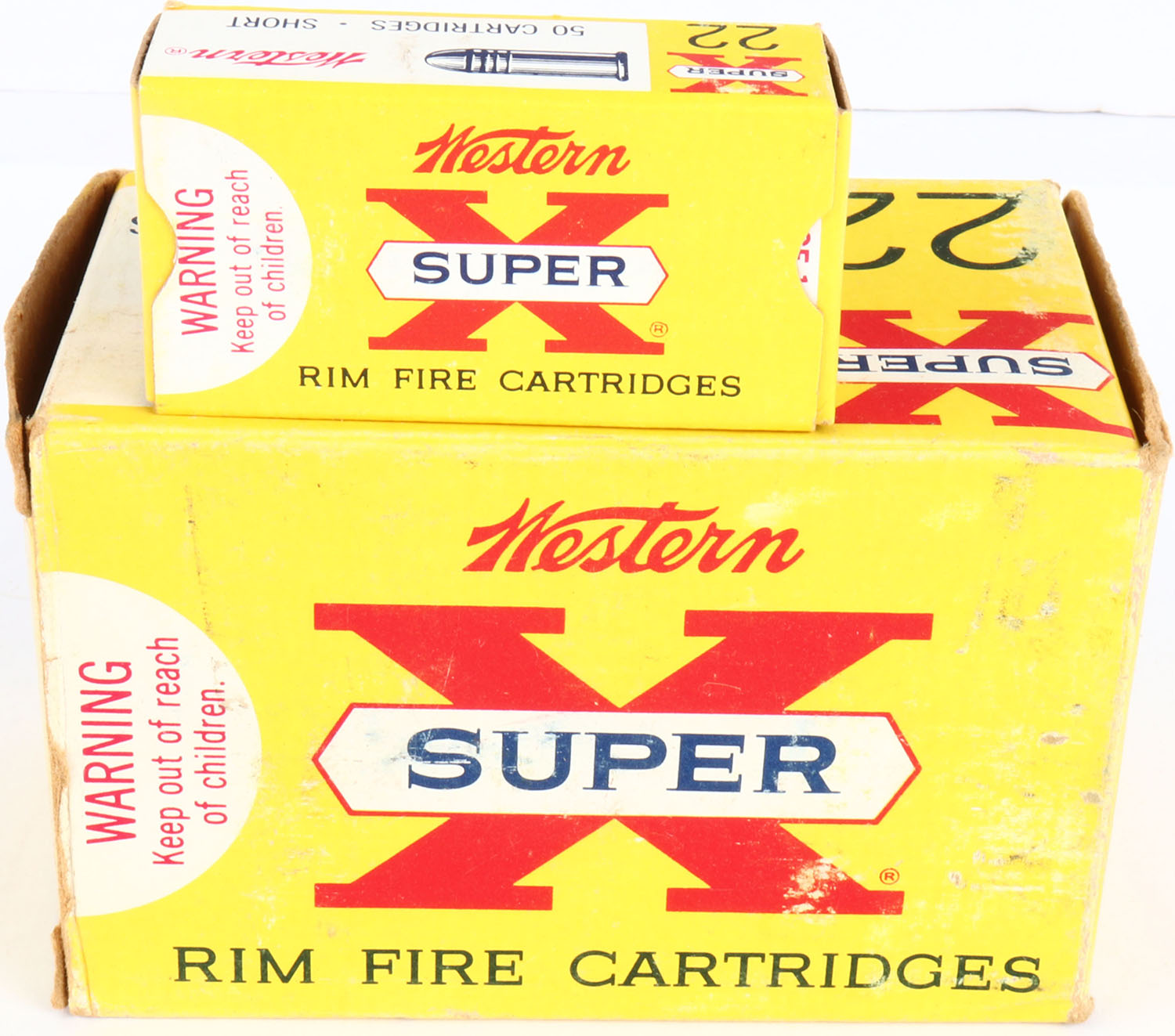 Western, Super X, .22 Short, Lubaloy Coated, Partial 7 boxes, 1pc. Yellow white & red brick, brick is solid with very good to excellent color, some shelf wear, minor corner wear, edges are mostly crisp, end flaps are solid, inside boxes are mint. Grade: Excellent - Value: 30 to 90