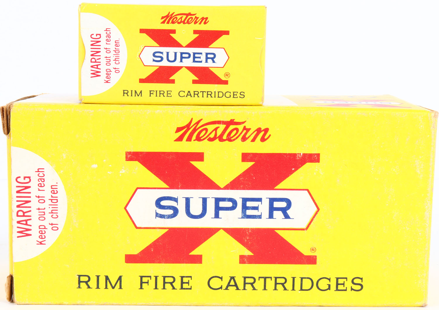 Western, Super X, .22 Long Rifle, Lubaloy Coated, Full, 500rds. 1pc. Yellow white & red brick, brick is solid with excellent color, very minor age soiling & corner wear, edges are mostly crisp, end flaps are solid, inside boxes are mint. Grade: Excellent + - Value: 50 to 150
