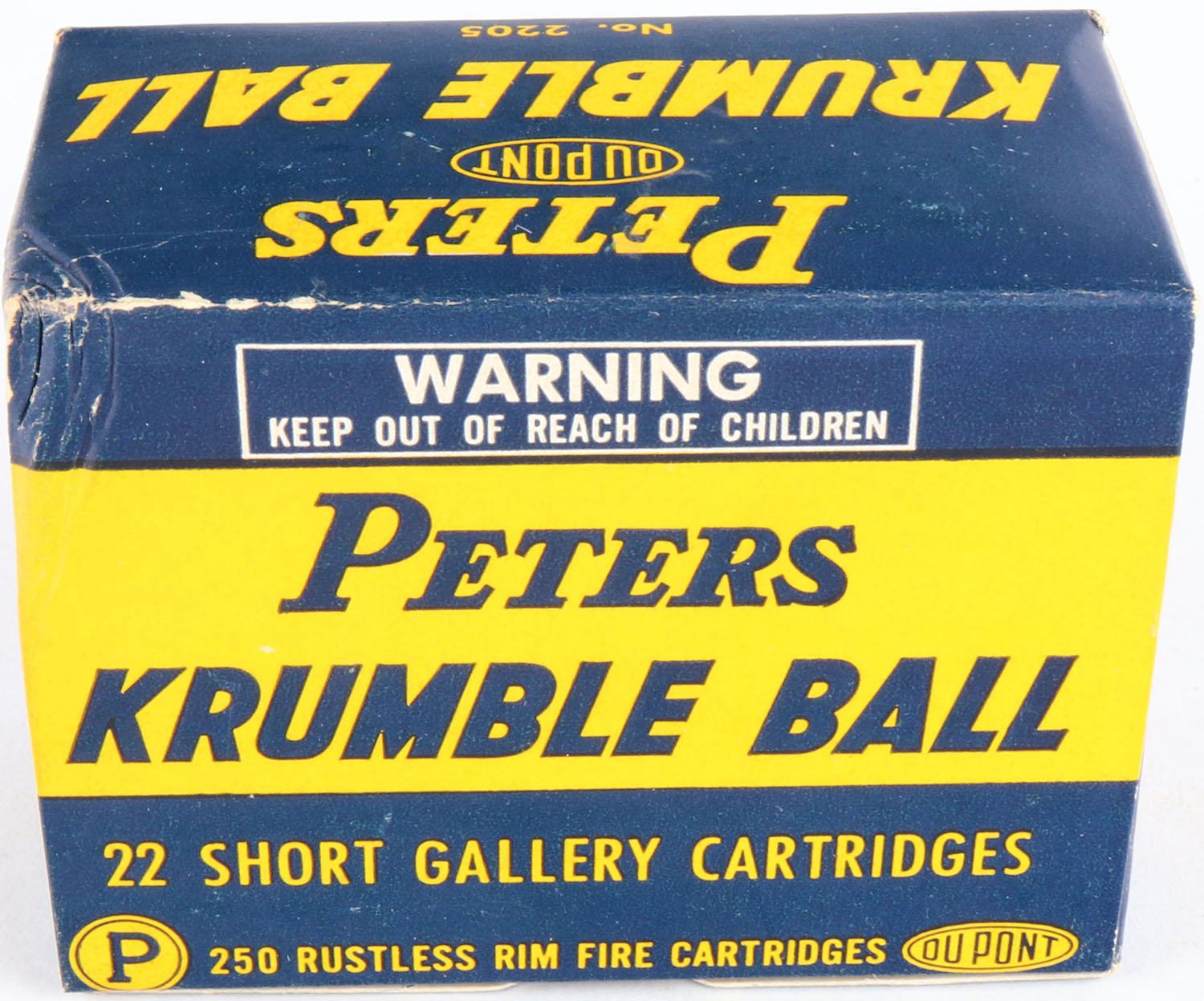 Peters, Krumble Ball, .22 Short, Gallery Cartridges, Full, 250rds. 1pc. Blue & yellow bulk box, box is near mint with mint color, only one small corner ding on top back corner, corners are otherwise mostly sharp, edges are crisp, top flap is solid, ammo is excellent. Grade: Excellent ++ - Value: 100 to 300