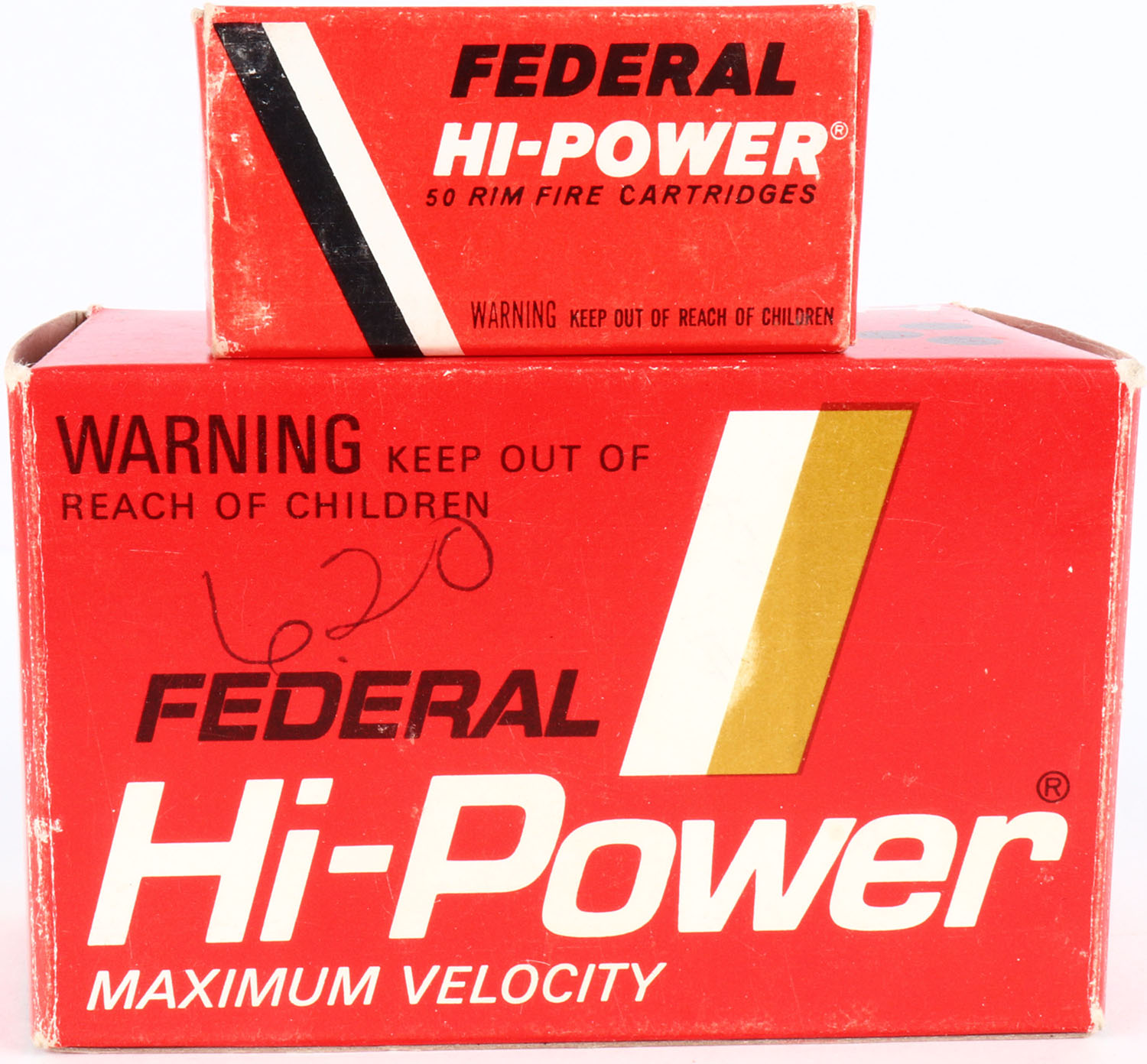 Federal, Hi-Power, .22 Short Hollow Point, Maximum Velocity, Full of .22 Short (NON-HP) Hi-Power boxes, 1pc. Red white & black box, box is solid with excellent color, very minor edge & corner wear, top has been written on, end flaps are solid inside boxes are excellent. Grade: Excellent - Value: 30 to 90