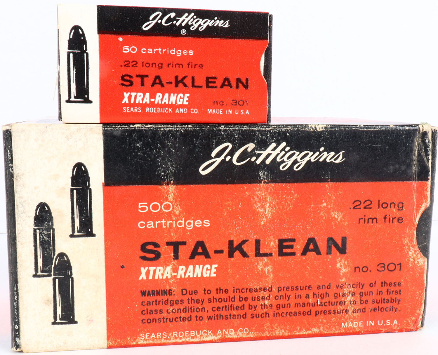 Sears, J.C. Higgins Sta-Klean, .22 Long, Xtra Range, Full, 500rds. 1pc. Red white & black brick, brick is solid with very good color, some age soiling & shelf wear, minor corner wear, very minor edge wear, end flaps are solid, inside boxes are minty. Grade: Very Good ++ - Value: 50 to 150