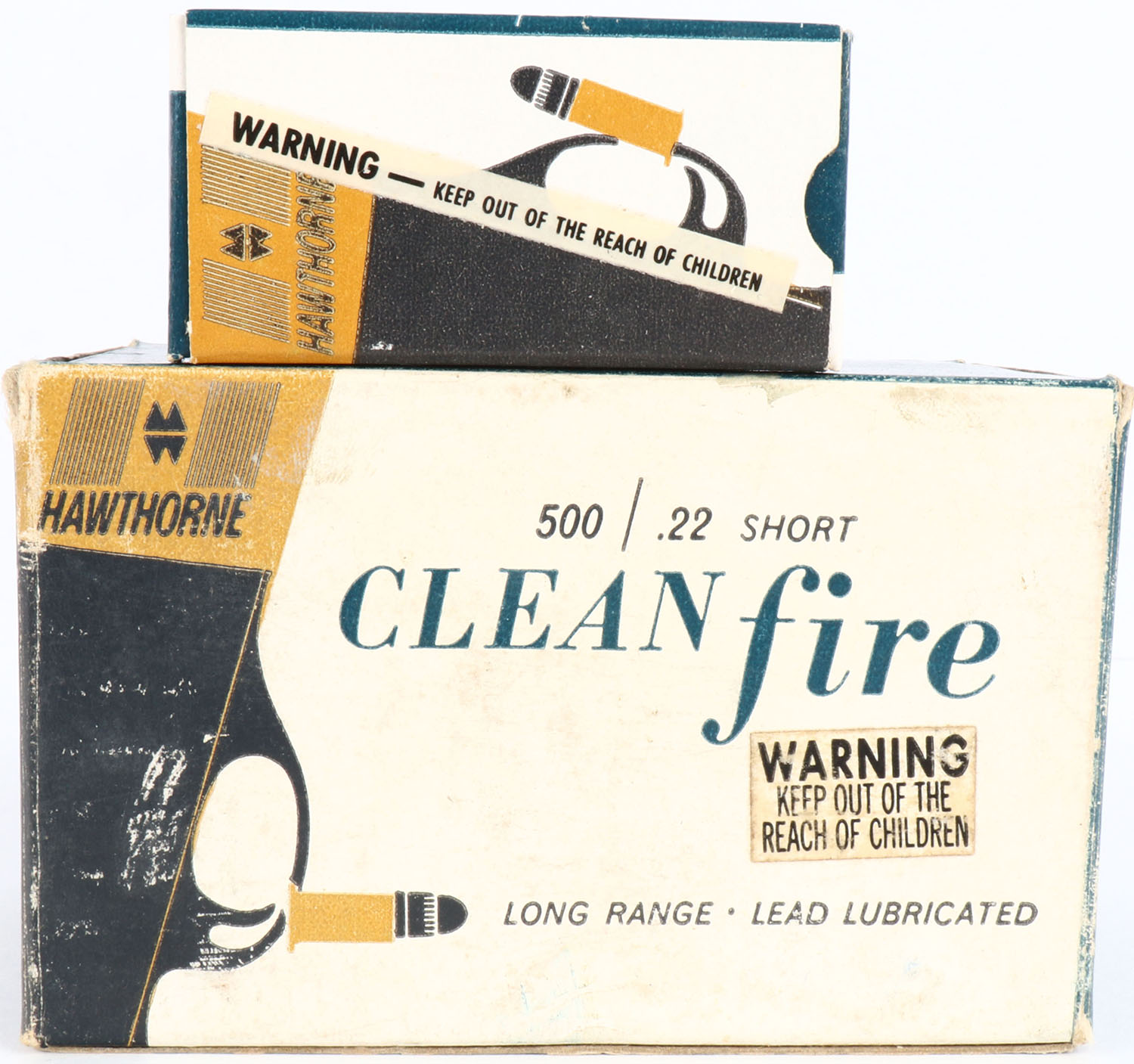 Wards, Hawthorne Clean Fire, .22 Short, Lead Lubricated, Partial 4 boxes, 1pc. White blue & black brick with white child warding over-label, brick is solid with very good to excellent color, some age soiling & shelf wear, minor corner wear, edges are mostly crisp, inside boxes are excellent. Grade: Very Good ++ - Value: 20 to 60