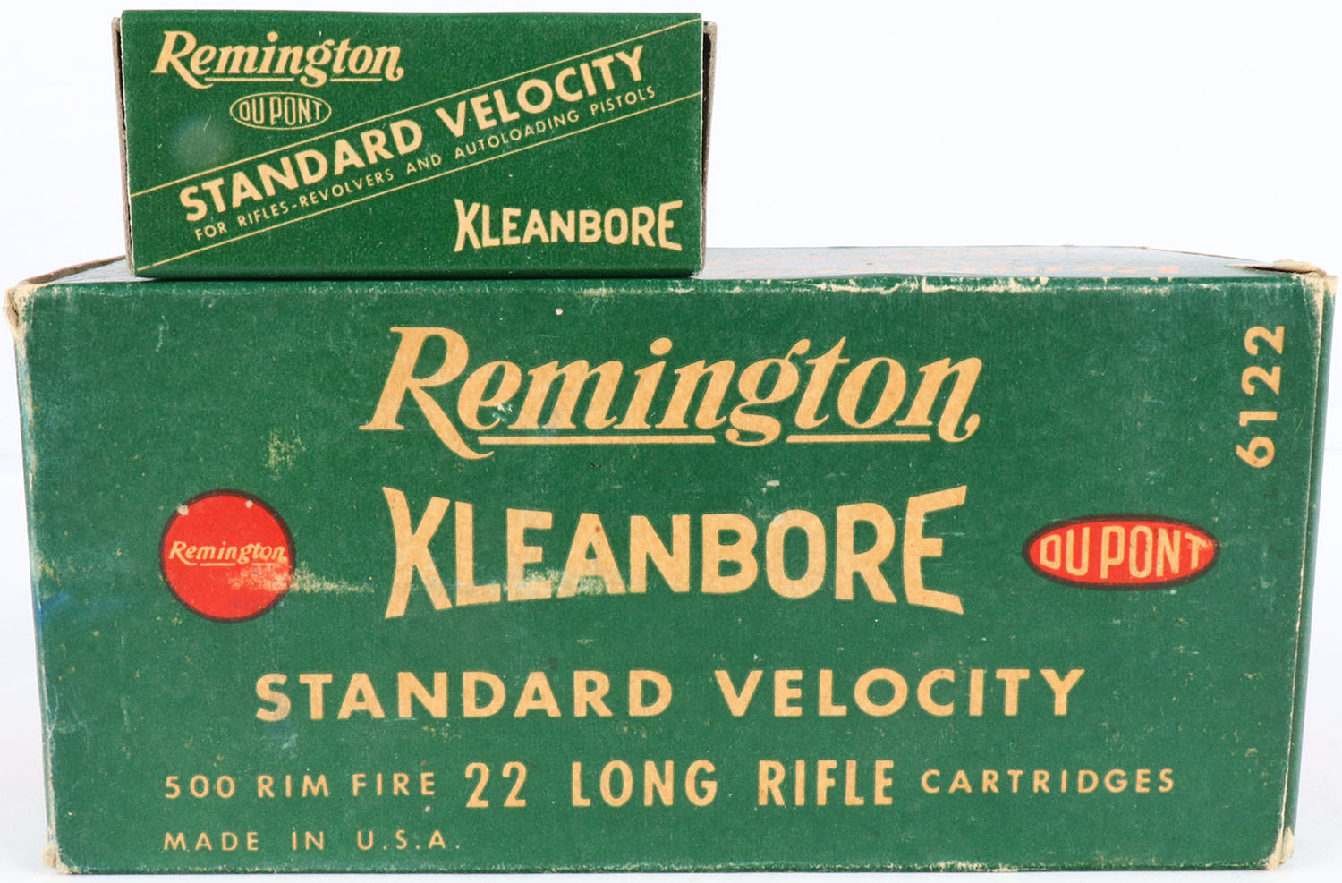 Remington, Kleanbore Standard Velocity, .22 Long Rifle, Full, 500rds. 1pc. Green white & red brick, brick is solid with excellent color, minor age soiling & shelf wear, some corner wear, very minor edge wear, end flaps are solid, inside boxes are minty. Grade: Excellent - Value: 50 to 150