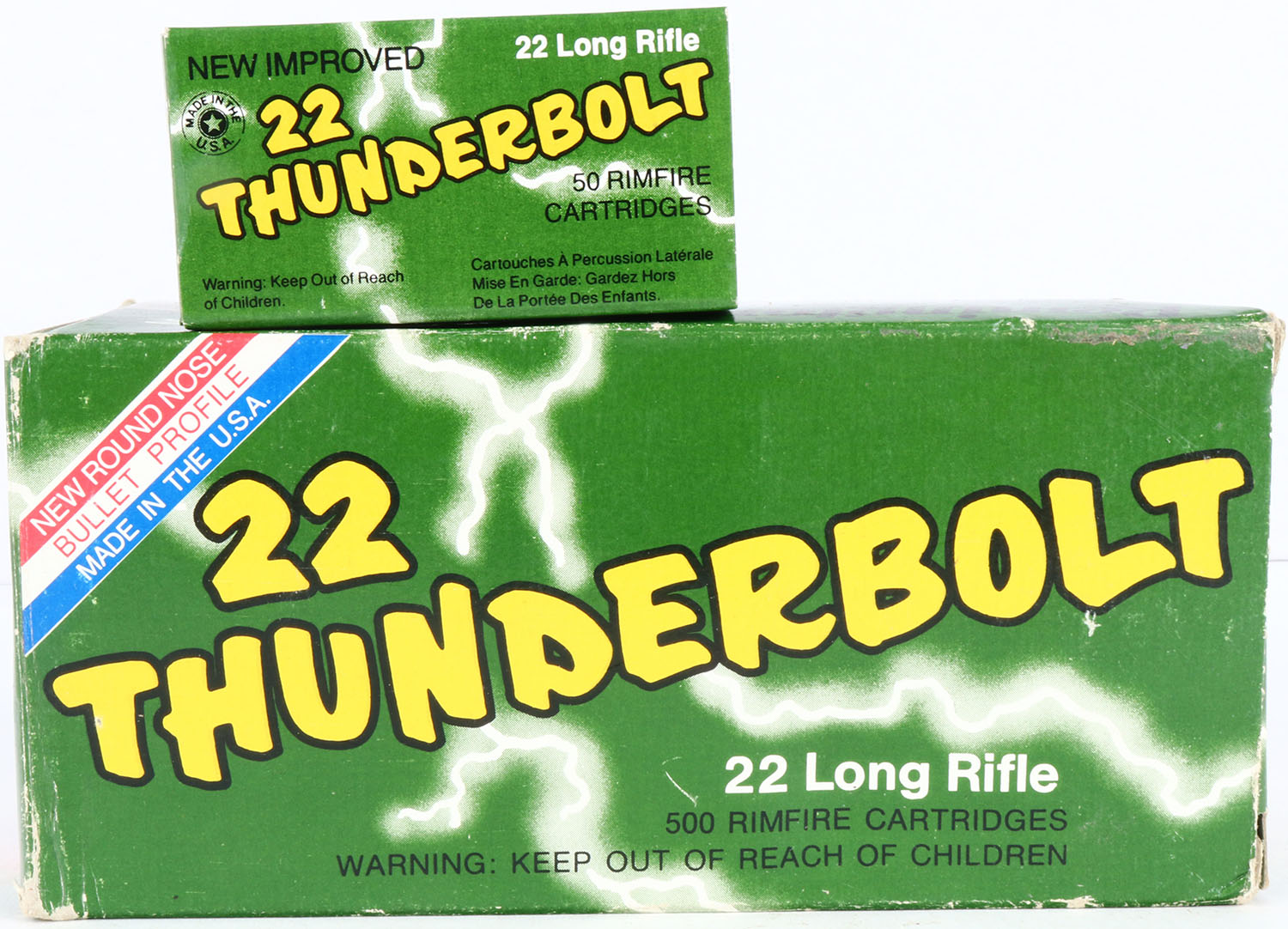 Remington, Thunderbolt, .22 Long Rifle, New Round Nose, Full, 500rds. 1pc. Green gray & yellow brick, brick is solid with excellent color, some corner wear, very minor edge wear, end flaps are solid, inside boxes are mint. Grade: Excellent + - Value: 20 to 60