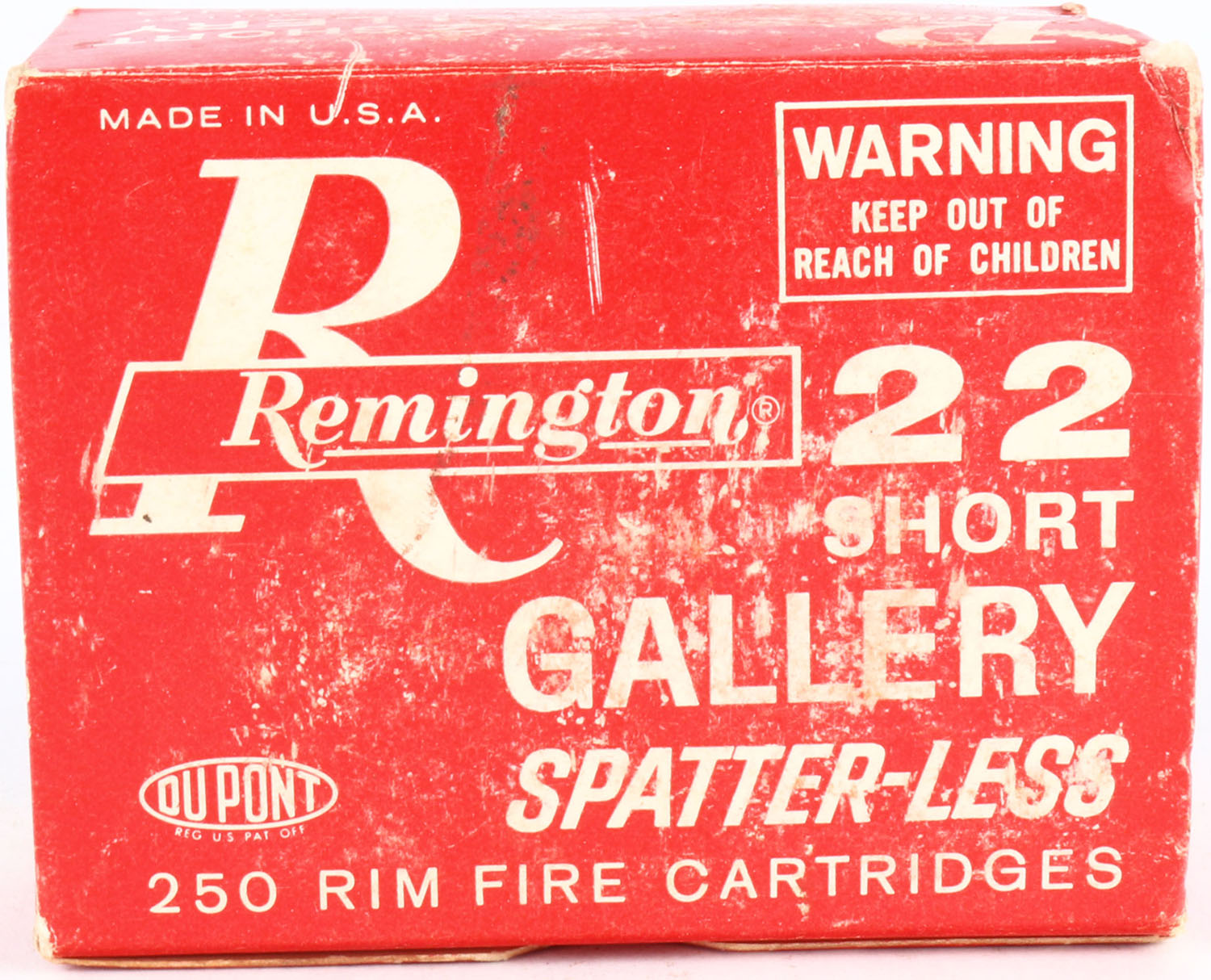 Remington, Gallery Spatter-Less, .22 Short, Full, 250rds. 1pc. Red & white bulk box, box is solid with very good color, shelf wear, some corner wear, very minor edge wear, top flap is solid, ammo is good to very good. Grade: Very Good + - Value: 50 to 150