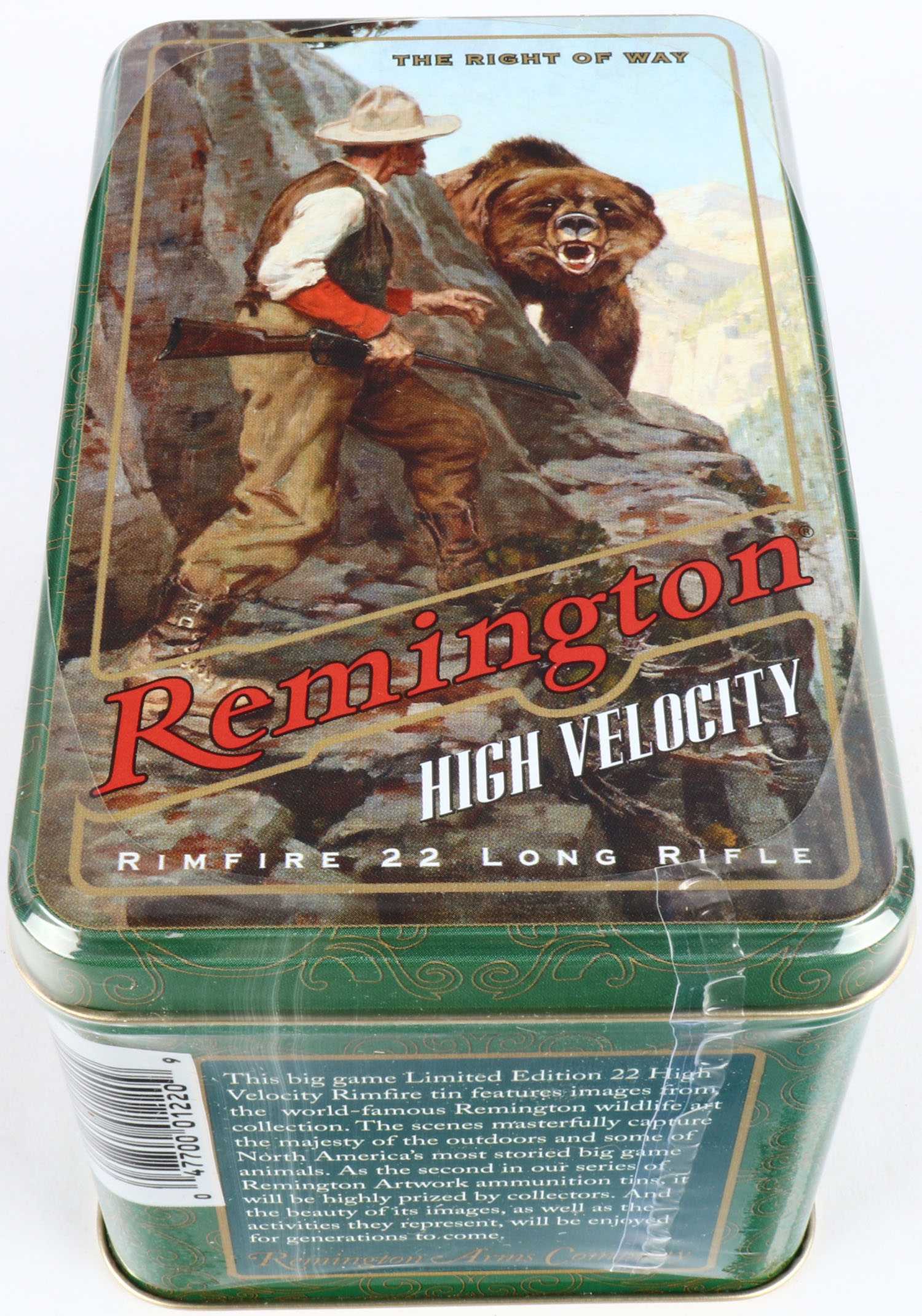 Remington, Limited Edition Collectors Tin, .22 Long Rifle, High Velocity, 1pc. FULL & SEALED, 400rds. Hinged tin features ''The Right of Way'' Classic Remington advertisement artwork. Grade: MINT - Value: 30 to 120