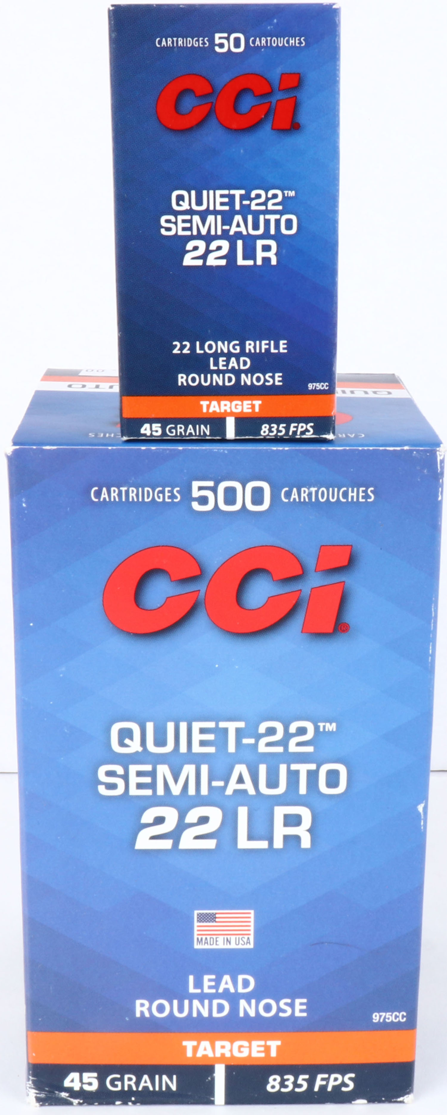CCi, Quiet-22 Semi-Auto, .22 Long Rifle, 45 Grain Lead Round Nose, 835 FPS, Full, 500rds. 1pc. Blue & red brick, brick is solid with minty color, very minor edge & corner wear, end flaps are solid, inside boxes are mint. Grade: Excellent ++ - Value: 50 to 100