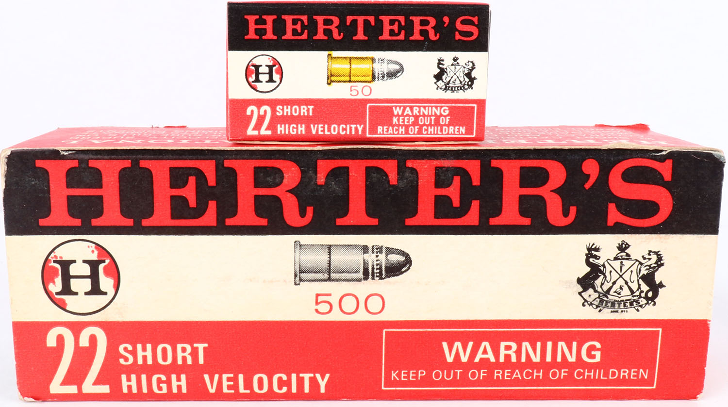 Herter's, .22 Short, High Velocity, Full, 500rds. 1pc. Red white & black brick, brick is solid with excellent color, minor shelf wear, some staining to front, very minor corner wear, edges are crisp, top flap is solid, retail price tag on right end, inside boxes are mint. Grade: Excellent - Value: 100 to 300