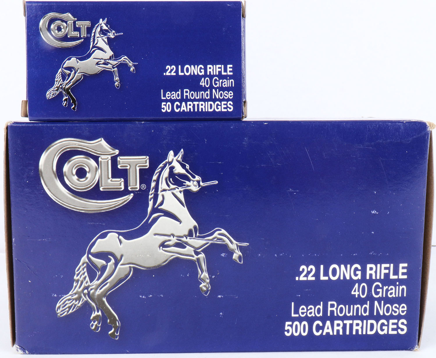 Aguila, Colt, .22 Long Rifle, 40 Grain Lead Round Nose, Full, 500rds. 1pc. Blue & silver brick, brick is solid with minty color, very minor corner wear, edges are crisp, end flaps are solid, inside boxes are mint. Grade: Excellent ++ - Value: 100 to 300