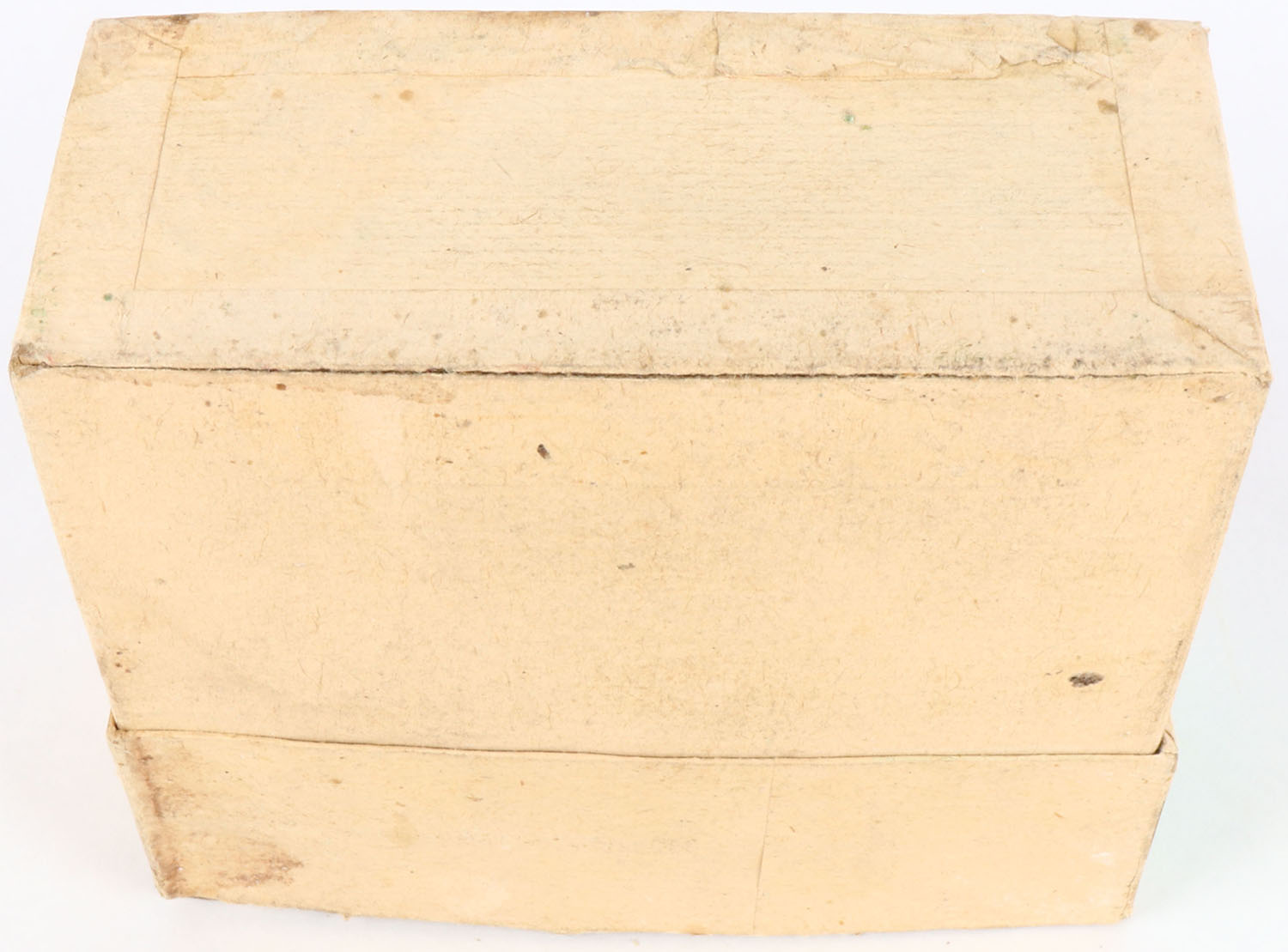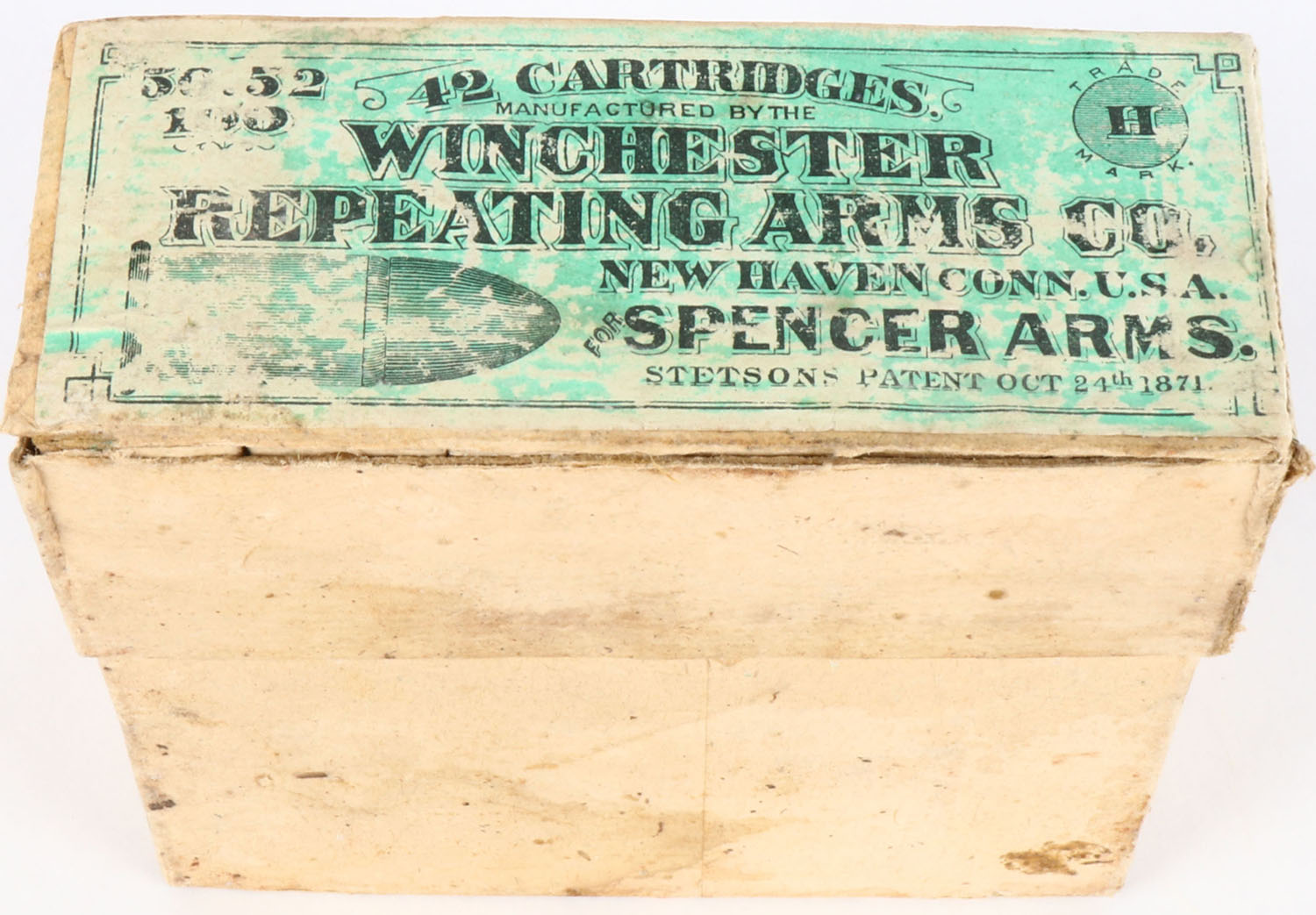 Winchester, .52 Spencer, Rim Fire, Full, 2pc. Buff box with green top label, top of lid has 3 seam splits, box has good color, some age soiling & staining, shelf wear, some edge & corner wear, ammo is good. Grade: Very Good - Value: 300 to 900