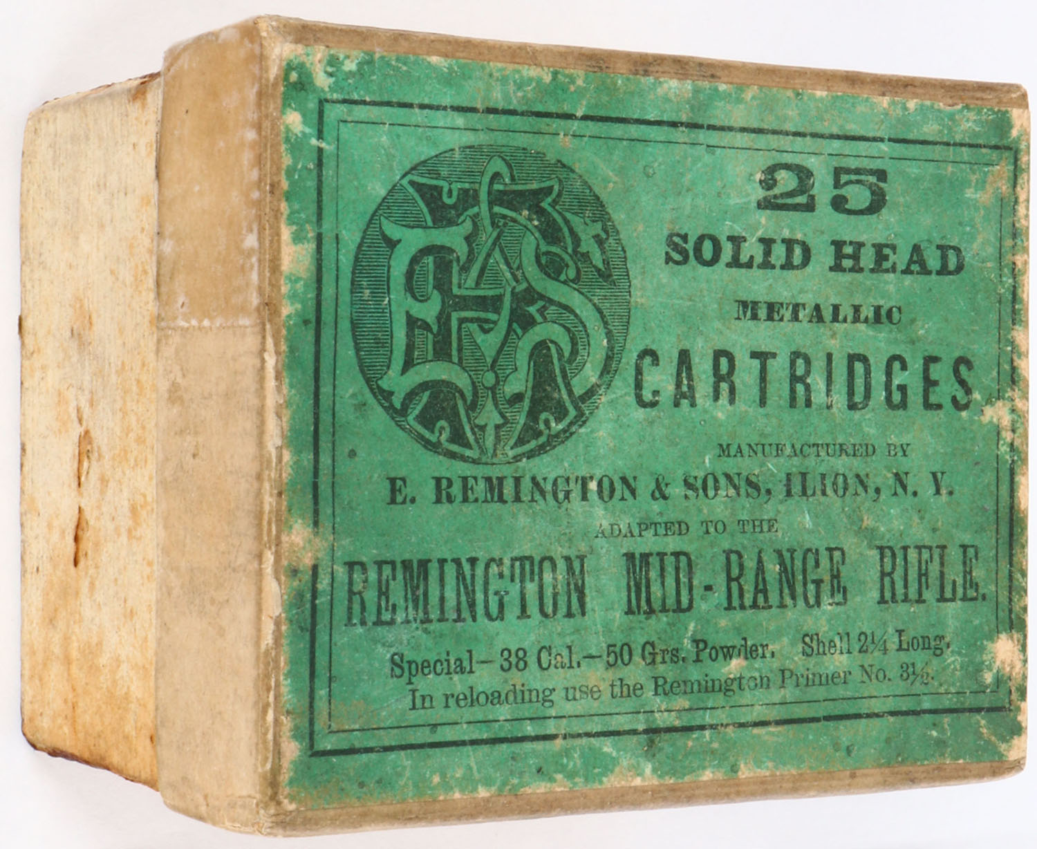 E. Remington & Sons, Metallic Cartridges, .38-50, Solid Head Cartridges, Partial, 2rds. 2pc. Buff box with green top label, box is solid with very good color, some age soiling, staining to bottom, minor shelf wear, some edge & corner wear, ammo is excellent. Grade: Very Good + - Value: 10 to 50