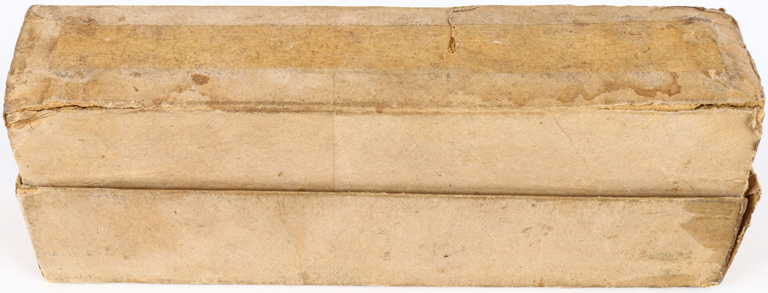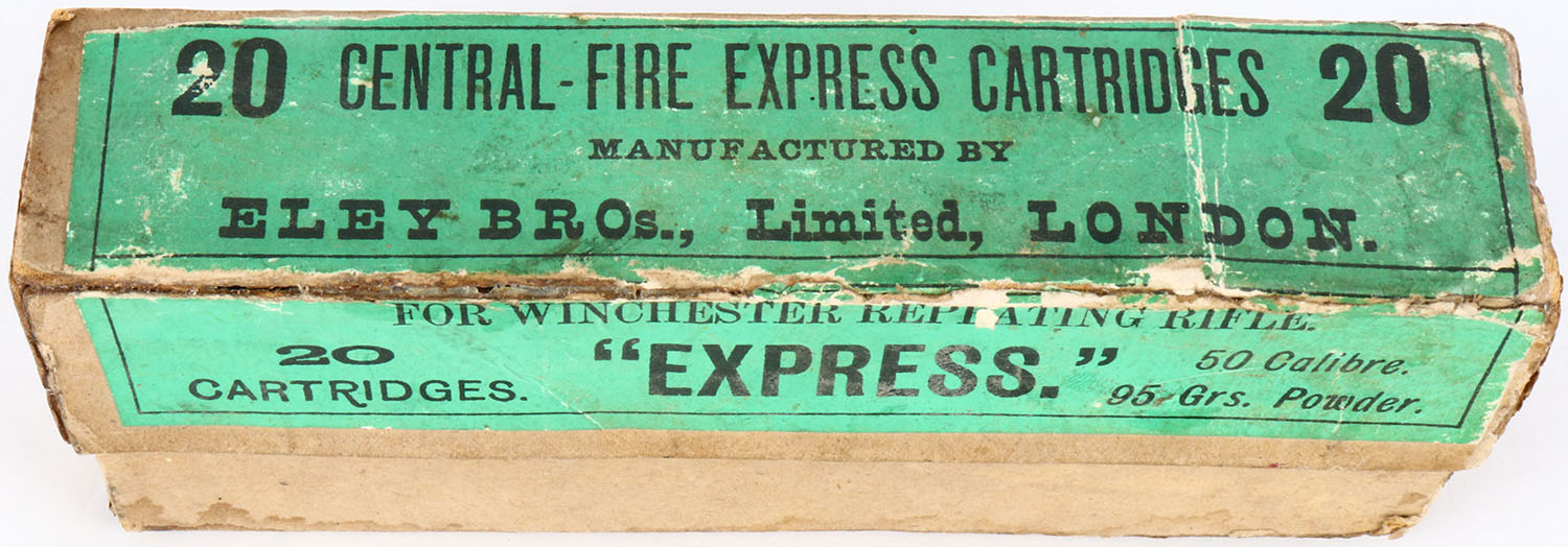 Eley Bros., ''Express'', .50 Calibre, 95 Grs. Powder, Full, 2pc. Buff box with green label, box is solid with excellent color, minor age soiling, some shelf wear, top has several repaired seam splits, label is intact, ammo is excellent. Grade: Very Good + - Value: 40 to 120