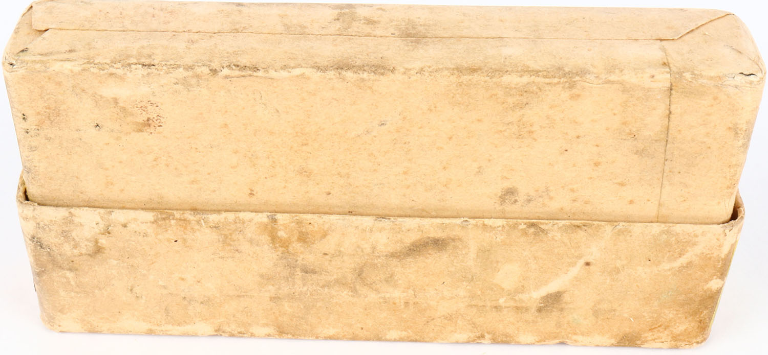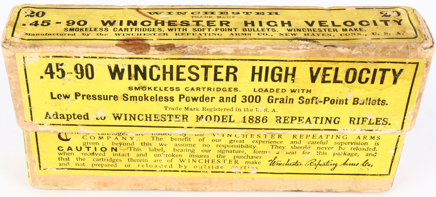 Winchester, .45-90 Winchester High Velocity, low Pressure Smokeless Powder, 300 Gr. Soft-Point bullet, 2pc, Partial 15 Rds., buff box with yellow label & black print, box is solid with stains on top label, light age soiling, rub marks & edge wear, ammo is good. Grade: Very Good ++ - Value: 150 to 450