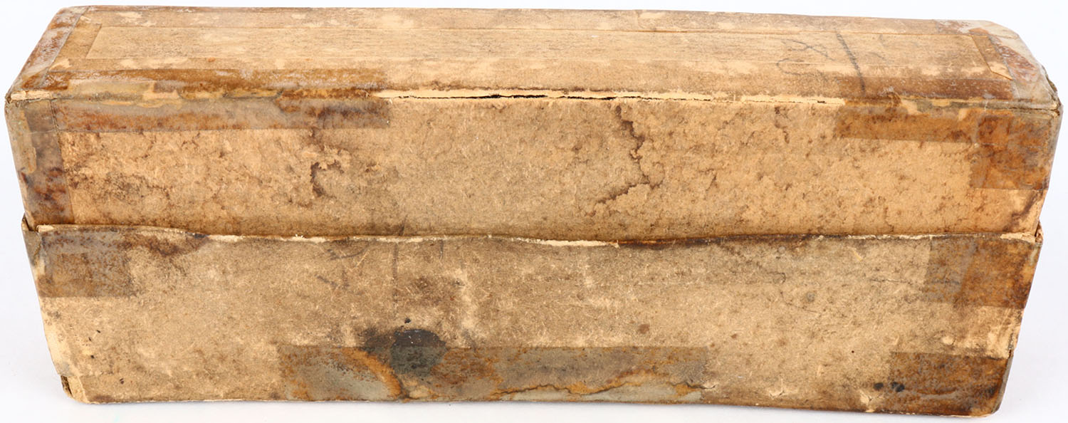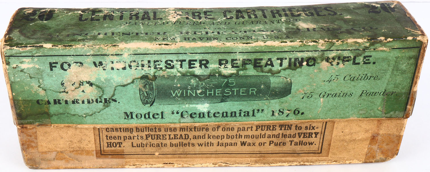 Winchester, .45-75, Model ''Centennial'' 1876, Full of mixed W.R.A. H/S & Primers, 2pc. Buff box with green label, box is solid with good color, age soiling, staining, shelf & edge wear, some corner wear, tape on ends, label is intact, ammo is excellent. Grade: Very Good - Value: 100 to 300