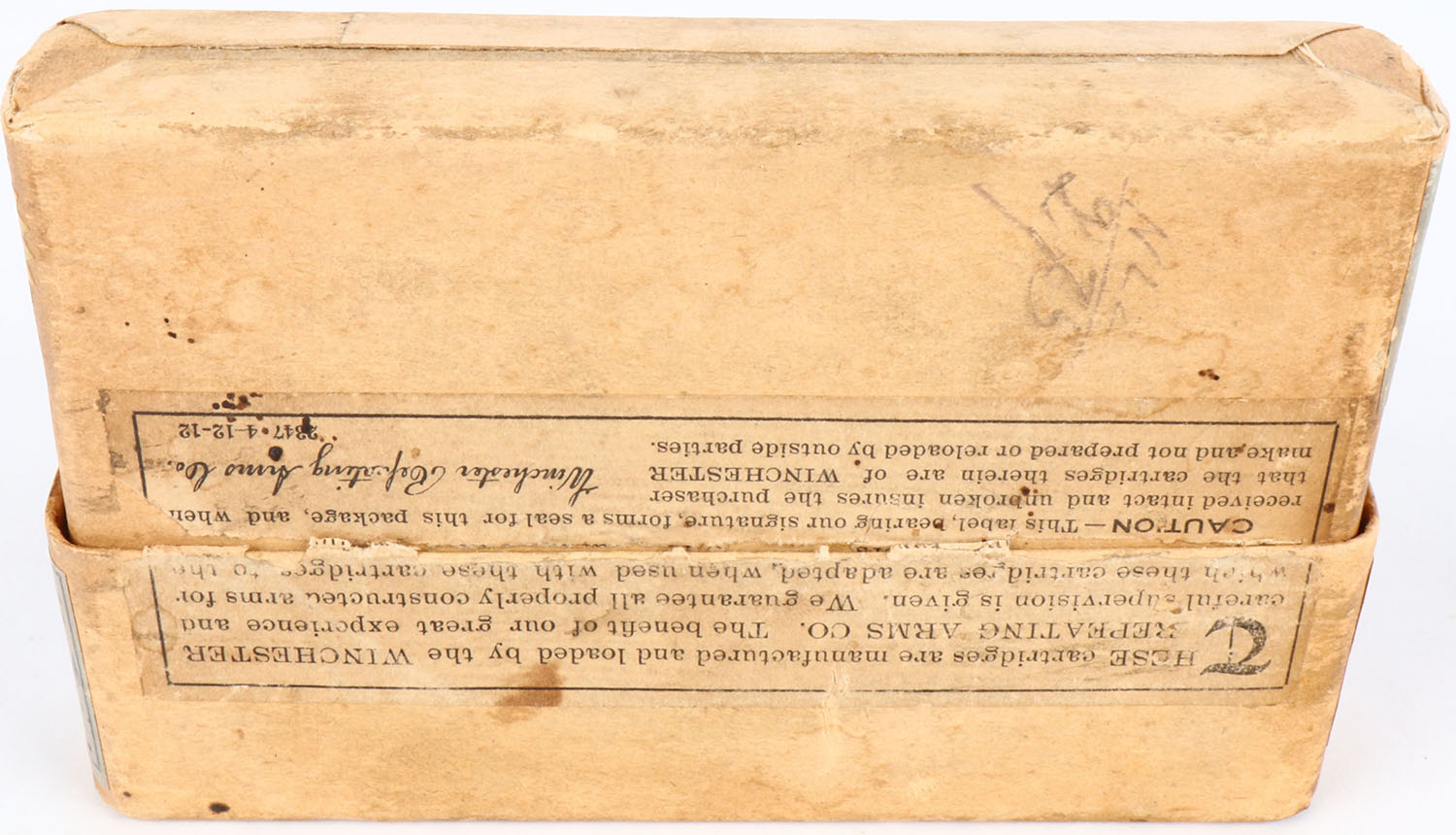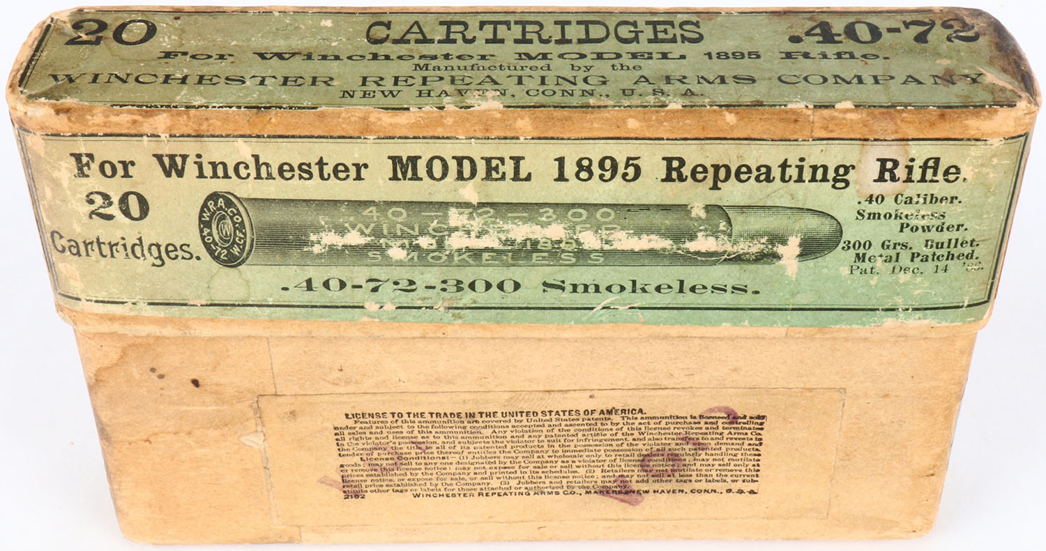Winchester, .40-72-300, Smokeless, Full, 2pc. Buff box with green labels, box is solid with very good color, some age soiling & shelf wear minor edge & corner wear, labels are intact, ammo is excellent. Grade: Excellent - Value: 50 to 150