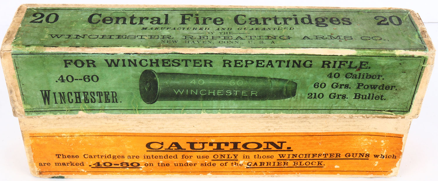 Winchester, .40-60-210 Winchester Repeating Rifle, 2pc., Full, buff box with green, orange & black label, box is solid with excellent color, corner wear, very minor edge wear, ammo is excellent. Grade: Excellent - Value: 200 to 400