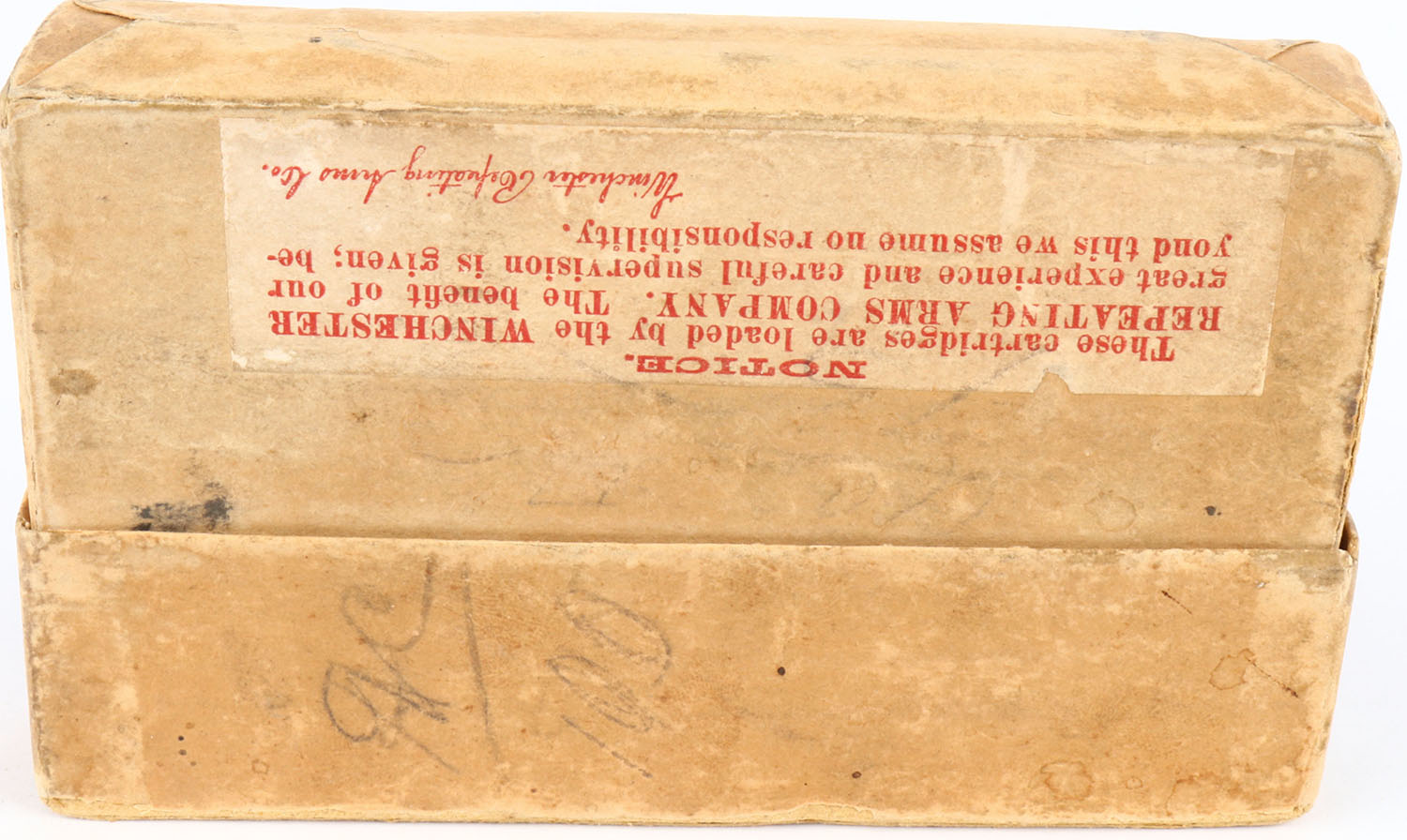 Winchester, .38-72-275, Model 1895, Full of mixed W.R.A. H/S & Primers, 2pc. Buff box with green label, box is solid with very good color, age soiling, some color fading & staining, some edge & corner wear, labels are 99% intact, ammo is excellent. Grade: Very Good ++ - Value: 30 to 90