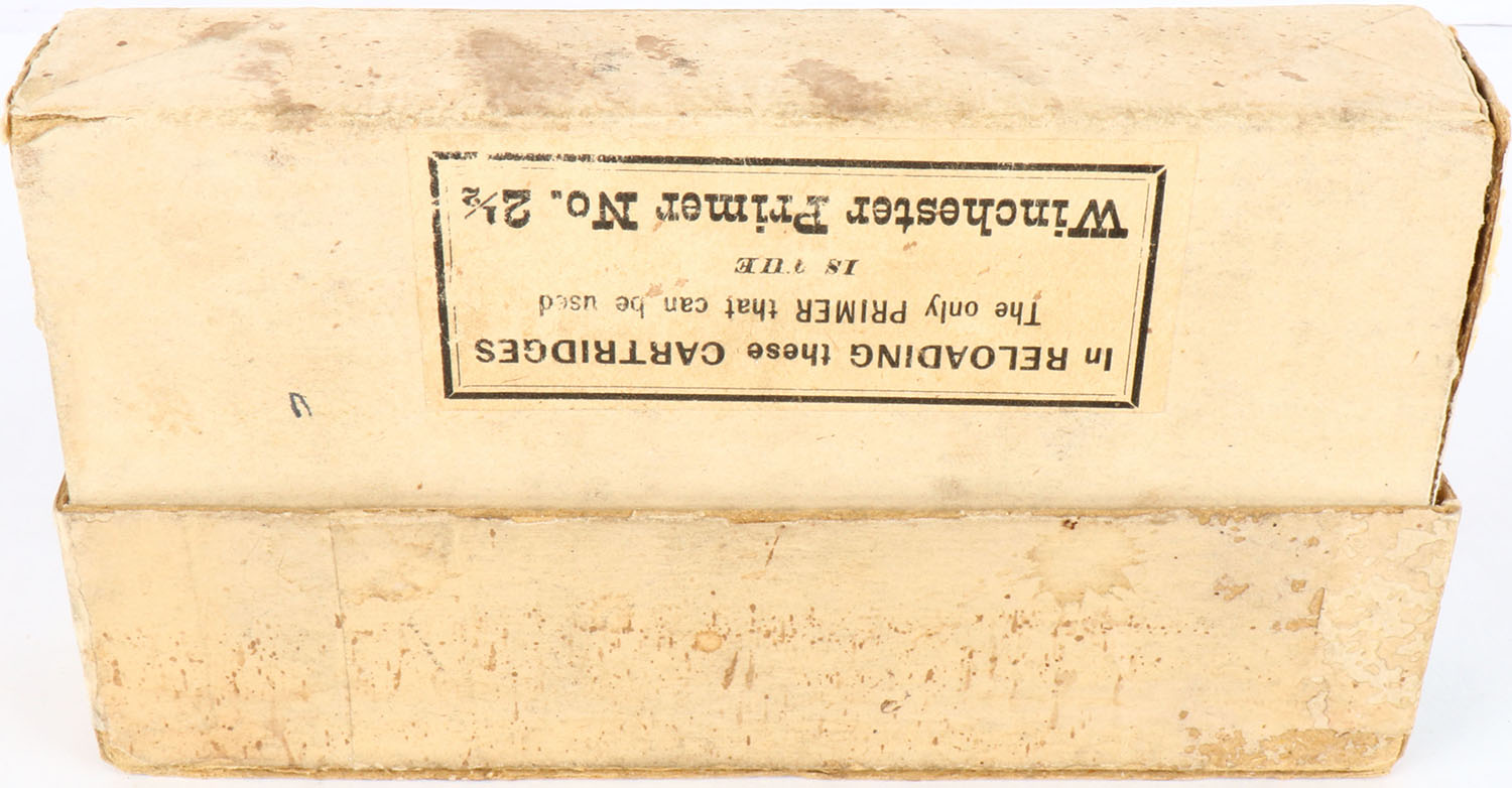 Winchester, Central Fire Cartridges, .32-40, 165 Grains Grooved Bullet, Full, 2pc. Buff box with green label, box is solid with excellent color, very minor age soiling, staining, minor edge & corner wear, label is intact, ammo is excellent. Grade: Excellent - Value: 50 to 150