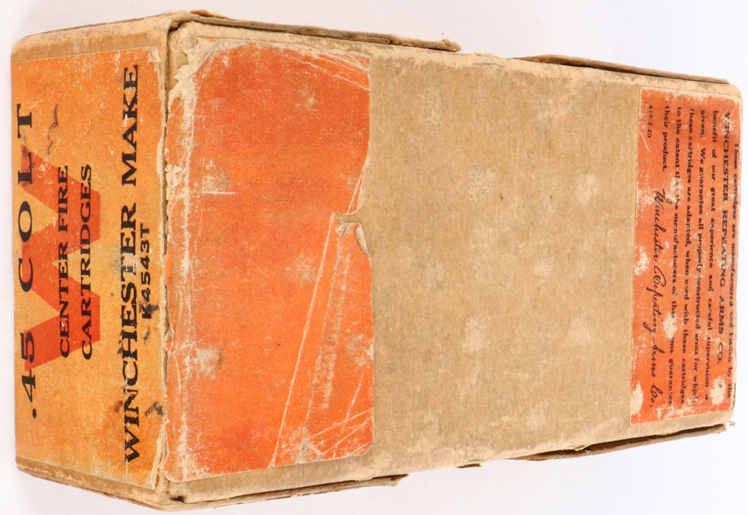 Winchester, Center Fire Cartridges, .45 Colt, 255 Grain Lead Bullets, Full of incorrect ammo (western), 2pc, buff box with green & orange wraparound label, box is solid with excellent color, some age soiling, tape on left end corners, some edge & corner wear, ammo is excellent. Grade: Very Good ++ - Value: 20 to 60
