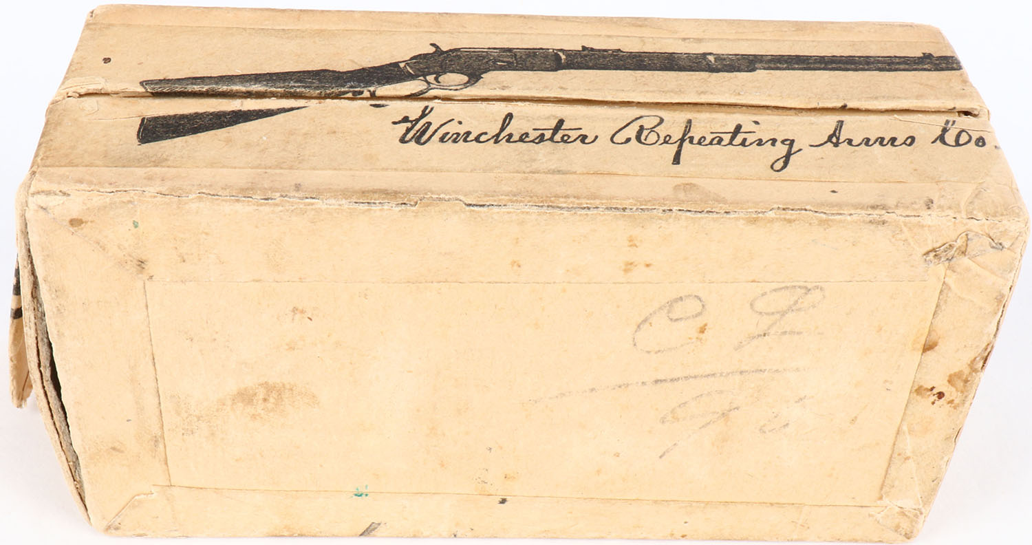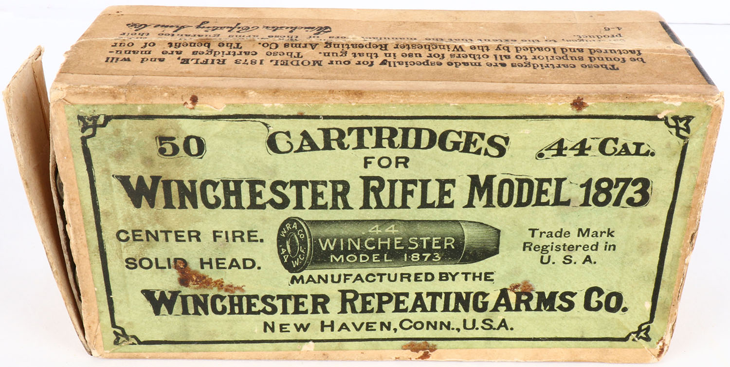 Winchester, .44 Cal., Model 1873, Full, 2pc. Buff box with green top & buff side sealing labels, box has 2 seam splits to left end of lid, excellent color, some staining, some edge & corner wear, labels are intact, ammo is excellent. Grade: Very Good ++ - Value: 100 to 300