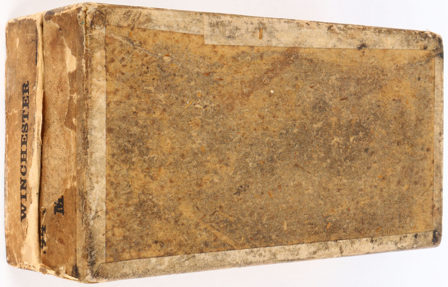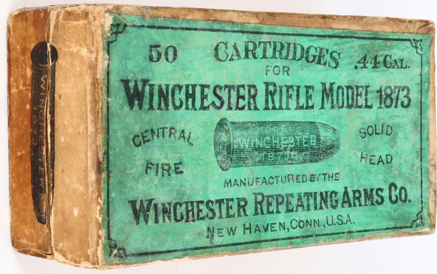 Winchester, .44 Cal, Model 1873, Empty, 2pc. Buff box with green top & buff side sealing labels, box is solid with very good color, age soiling & shelf wear, some edge & corner wear, labels are intact. Grade: Very Good + - Value: 8 to 40