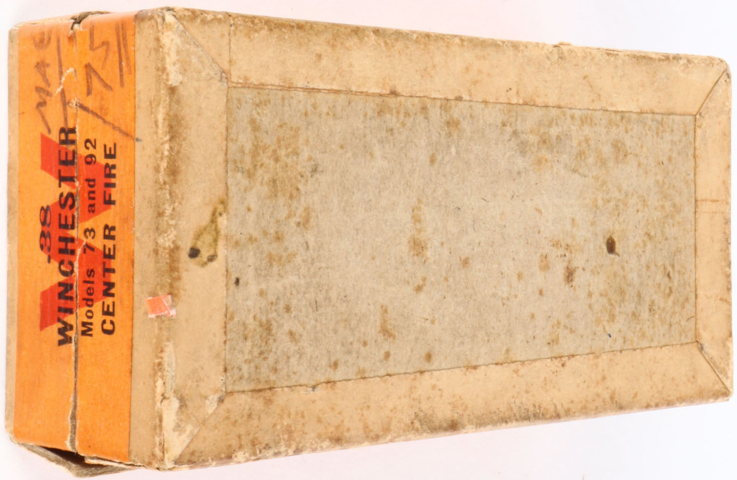 Winchester, .38 Winchester, 180 Gr. Lead Bullets, Partial 21rds., 2pc. Buff box with green top & orange side sealing labels, box is solid with very good to excellent color, minor age soiling, some color fading on top, vertical seam splits to all corners of lid, minor corner wear, very minor edge wear, labels are intact, ammo is very good. Grade: Very Good + - Value: 8 to 40