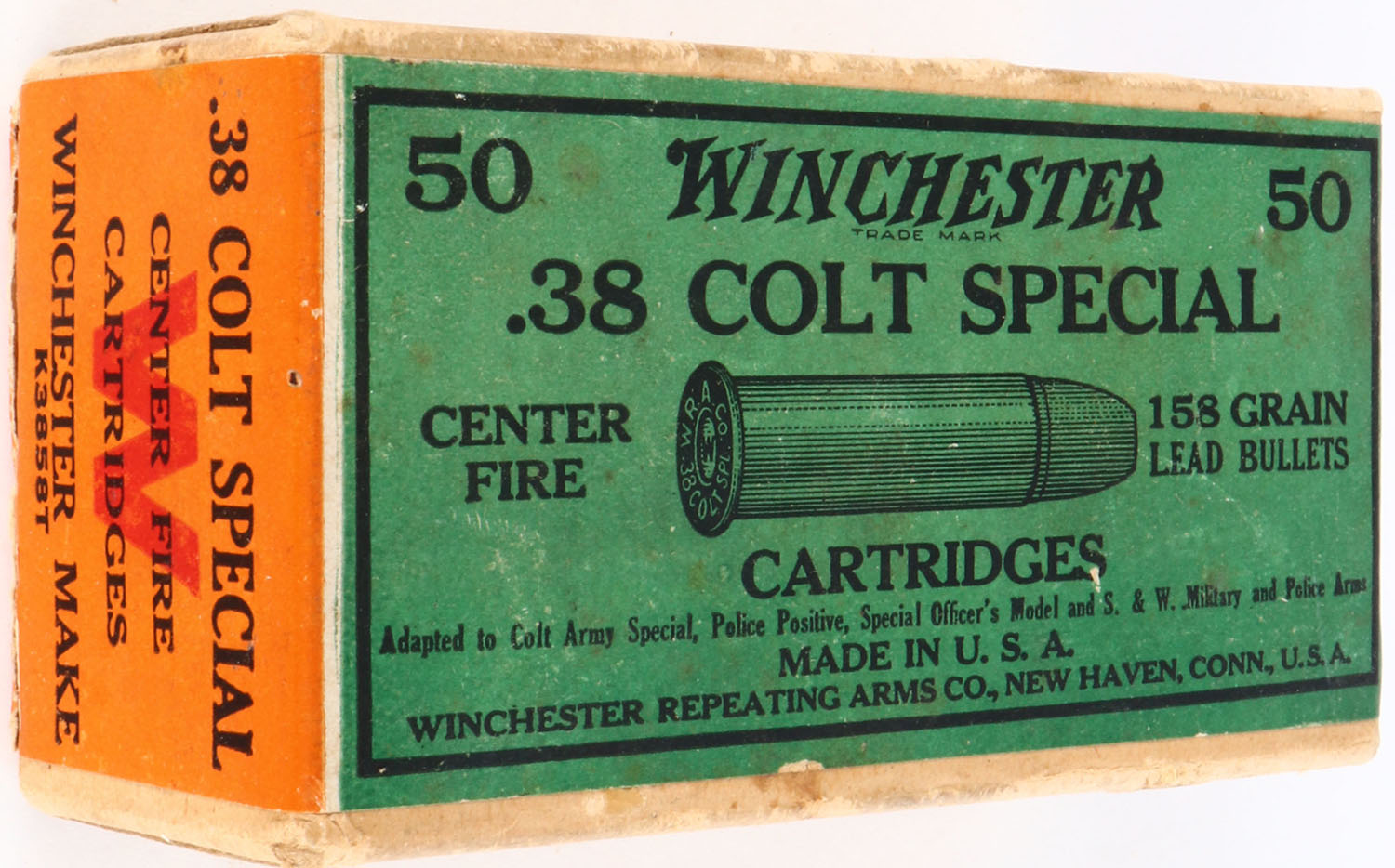 Winchester, .38 Colt Special, 158 Grain Lead Bullets, Partial 45rds., 2pc. Buff box with green & orange wraparound label, box is solid with excellent color, minor shelf wear on bottom, minor edge & corner wear, label is intact, ammo is very good to excellent. Grade: Excellent + - Value: 10 to 50